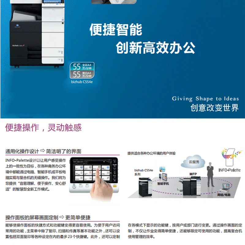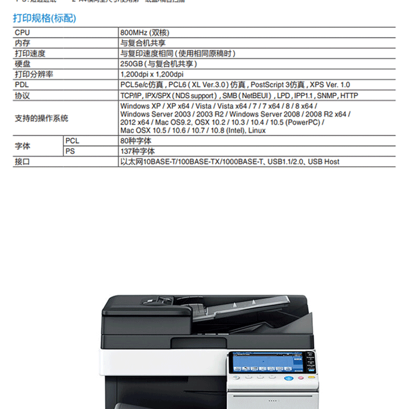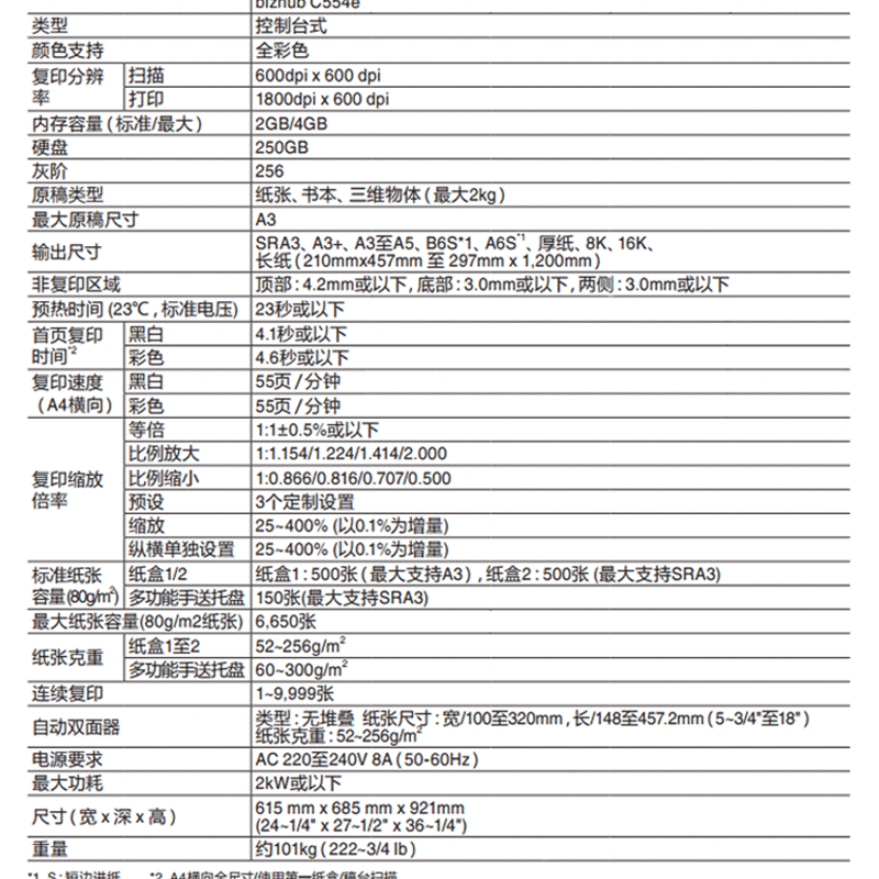 彩色復印/雙面網絡打印/彩色掃描/互聯(lián)網傳真/雙紙盒/2G內存250G硬盤 55張/分鐘 ?