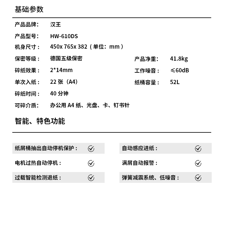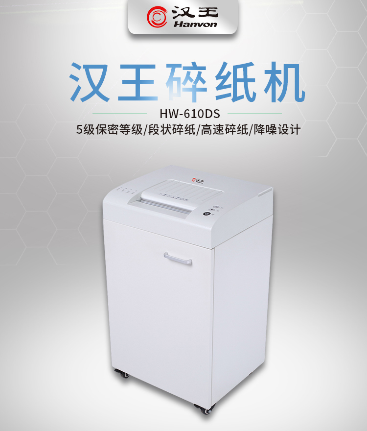 漢王(Hanvon)HW-610DS德國5級高保密碎紙機 段狀高速碎紙52L大容量辦公商用文件紙張粉碎機