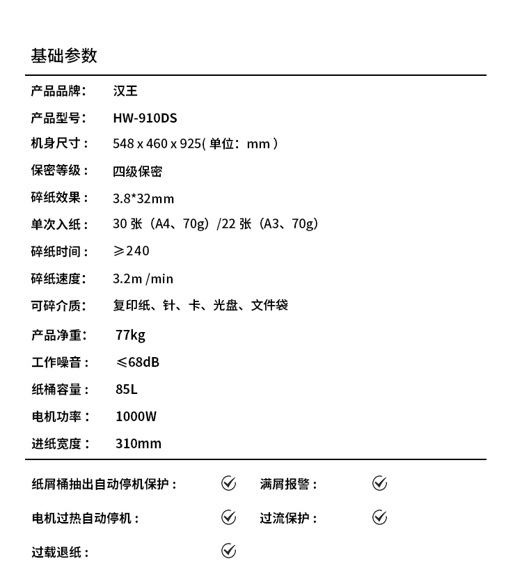 漢王(Hanvon)HW-910DS多功能大型商用辦公碎紙機(jī) 240分鐘長時(shí)間連續(xù)碎紙安全觸停粉碎機(jī)