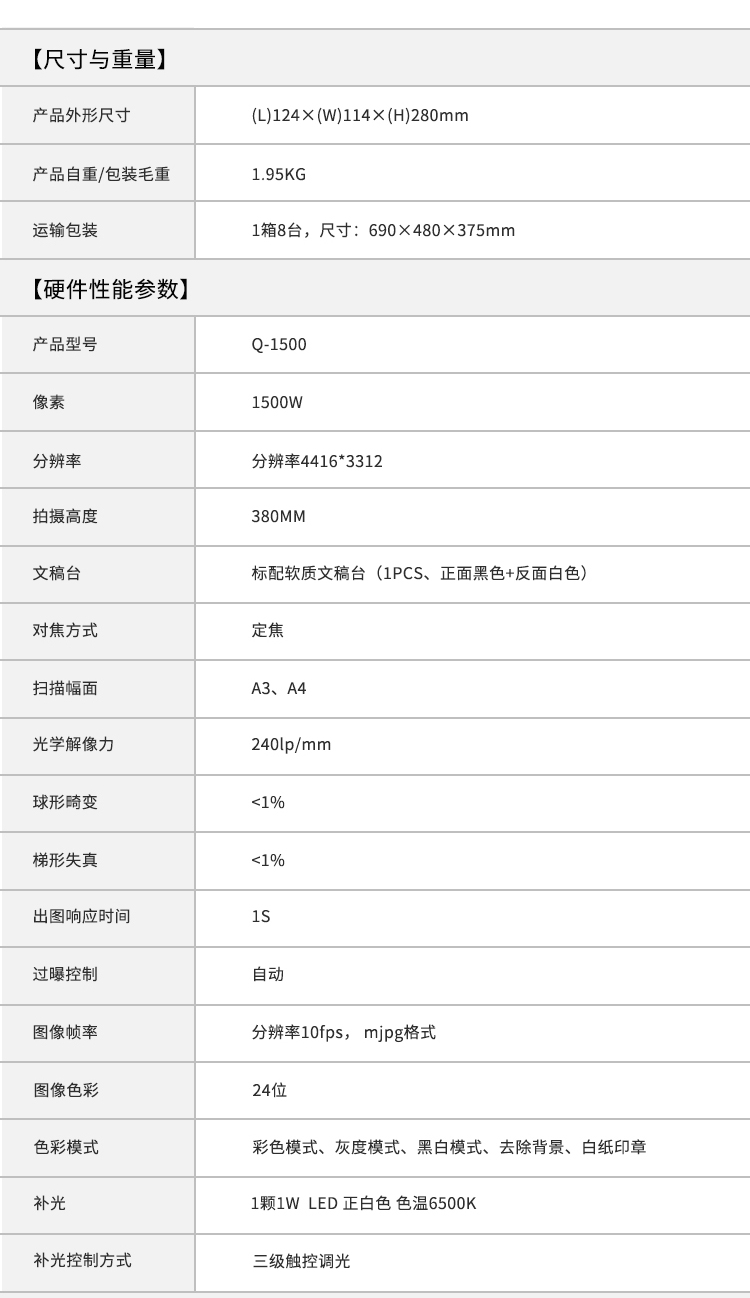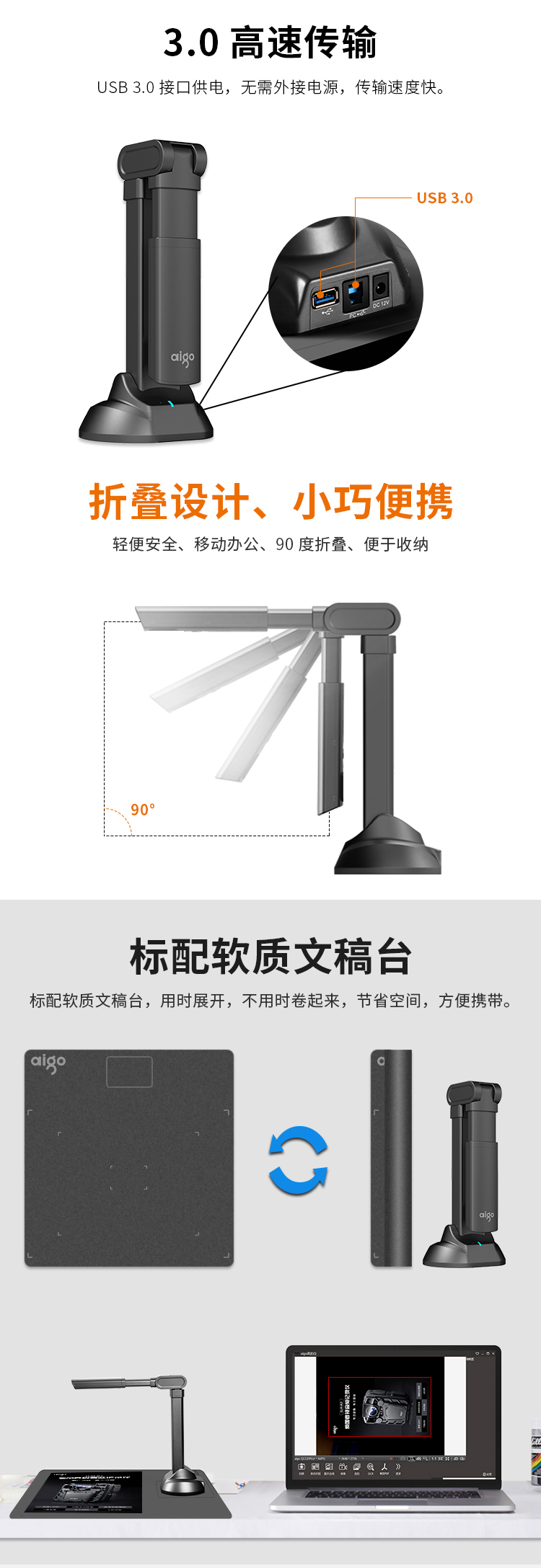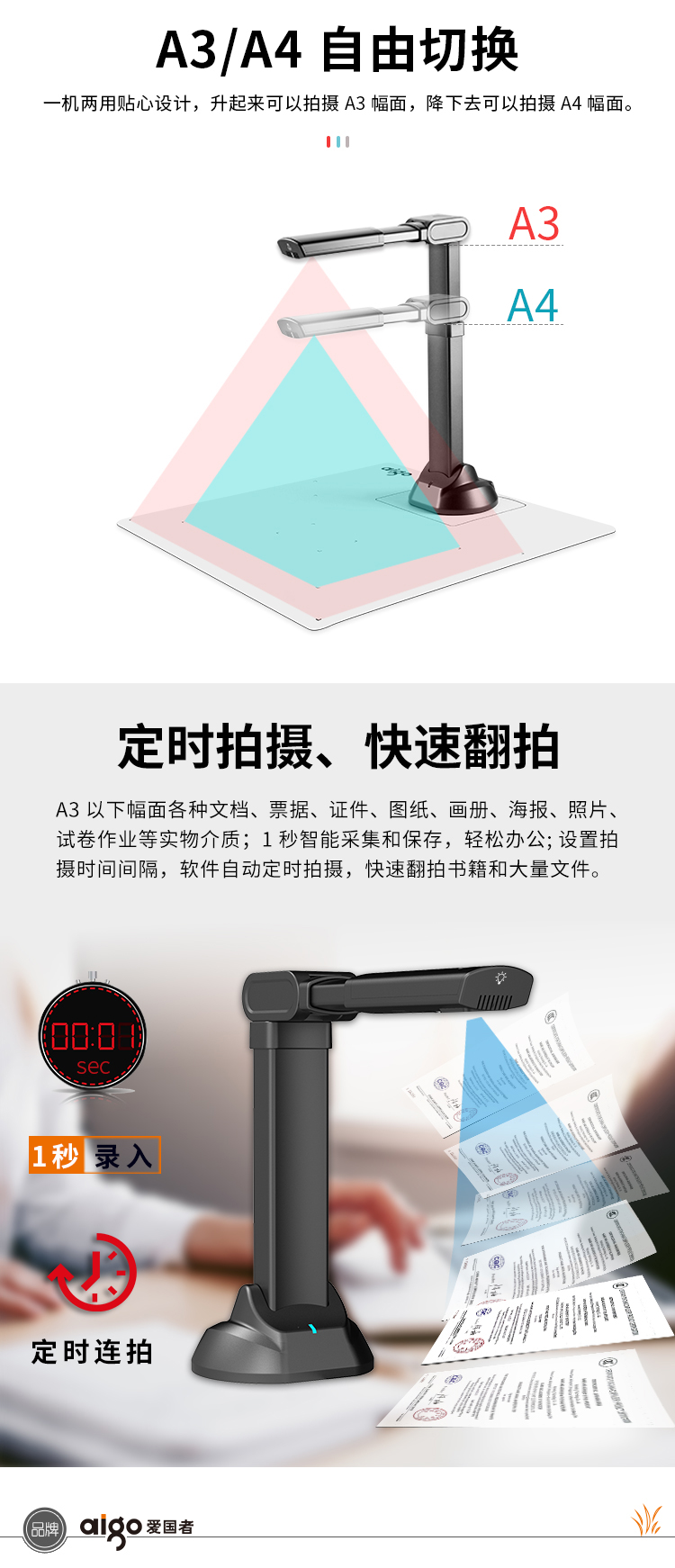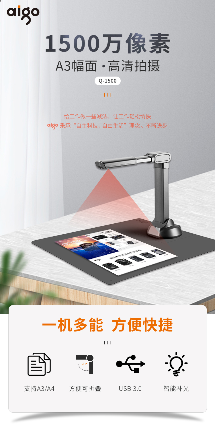 愛國者(aigo)Q-1500高拍儀掃描儀高速掃描項目工程投招標速拍儀1500萬高清像素單攝像A3/A4幅面可折疊送軟底