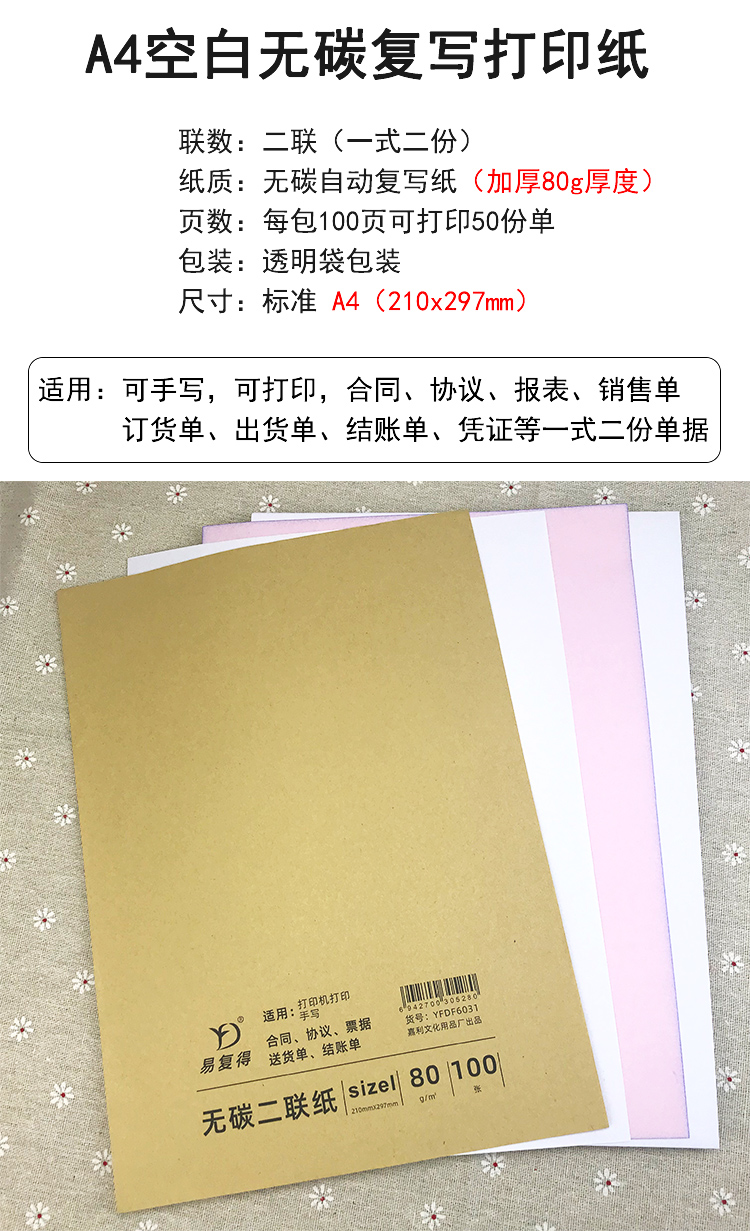 易復(fù)得紙品(YFD)兩聯(lián)無碳復(fù)寫紙A4/1包