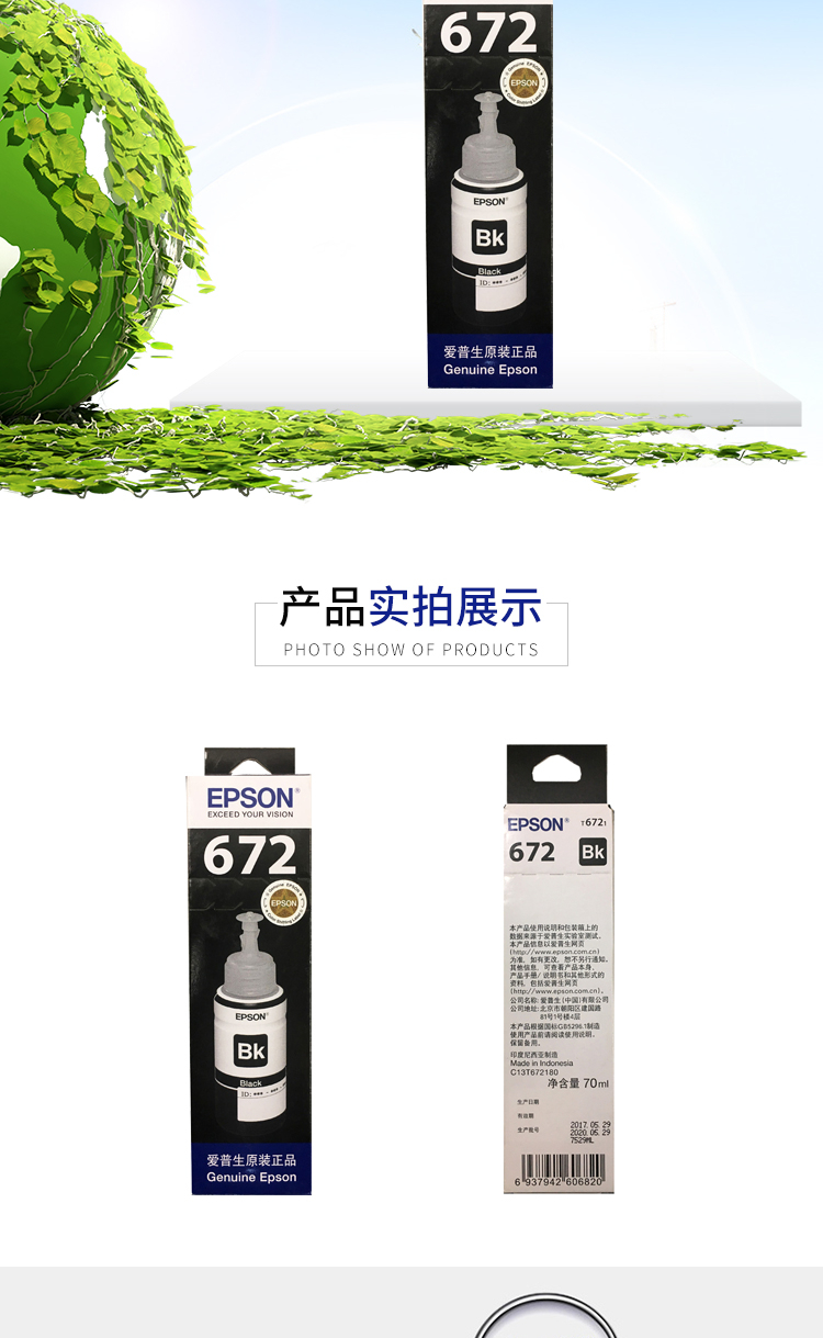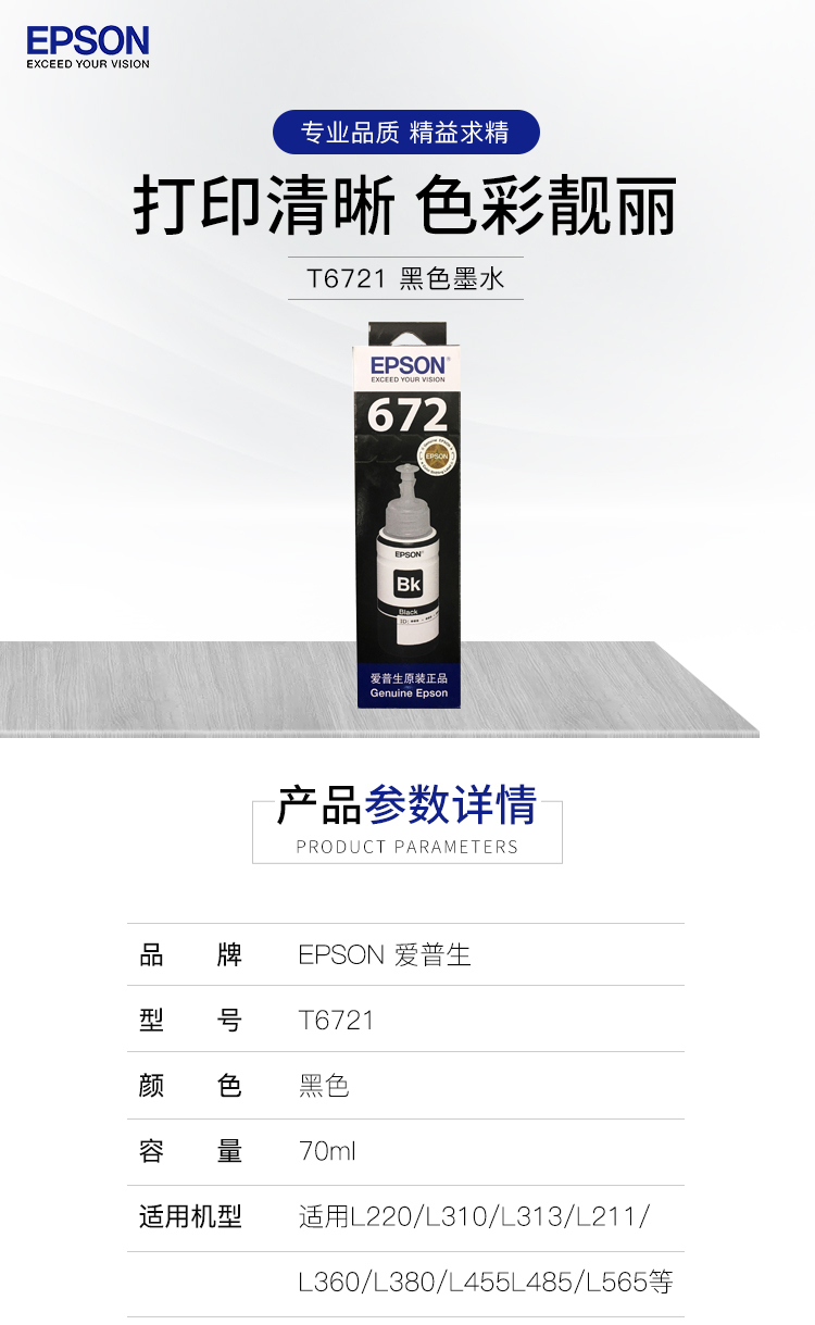 愛普生(EPSON)T6721 墨倉(cāng)打印機(jī)墨水 70ML 黑色