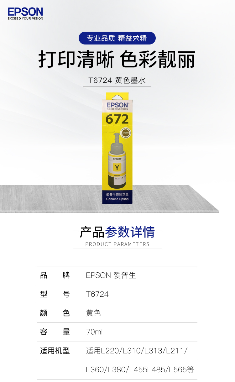愛普生(EPSON)T6724 墨倉打印機墨水 70ML 黃色