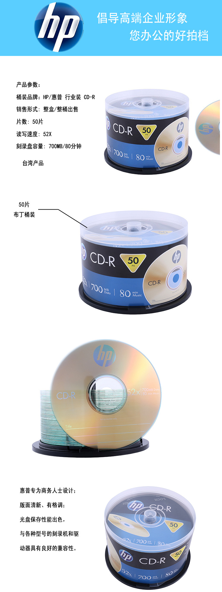 惠普(HP) CD-R 光盤 52速700MB 桶裝50片