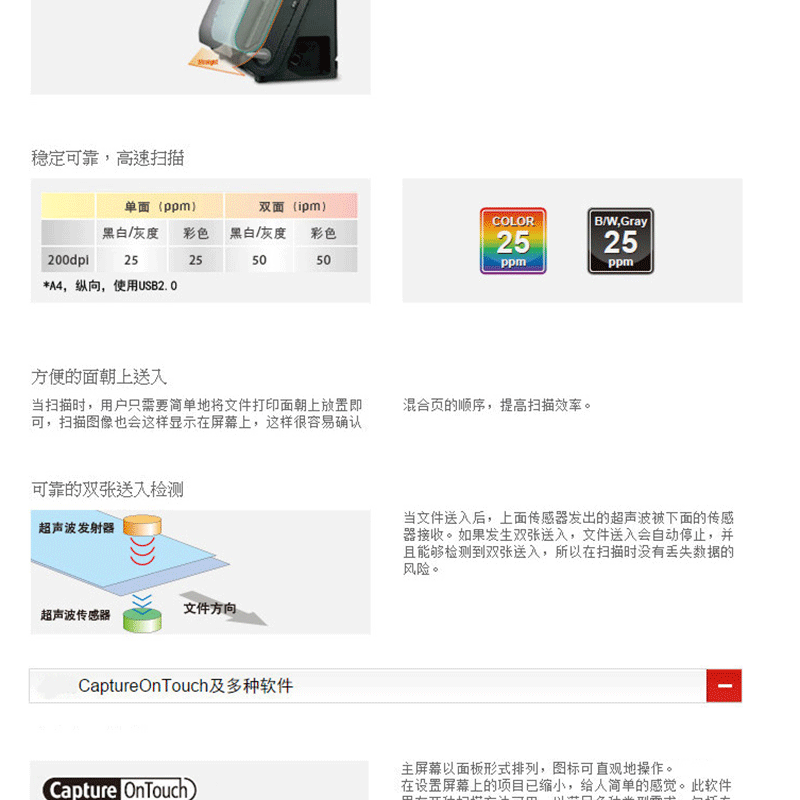 掃描速度25張/分鐘 內(nèi)置超聲波傳感器 一鍵掃描 USB2.0 ?