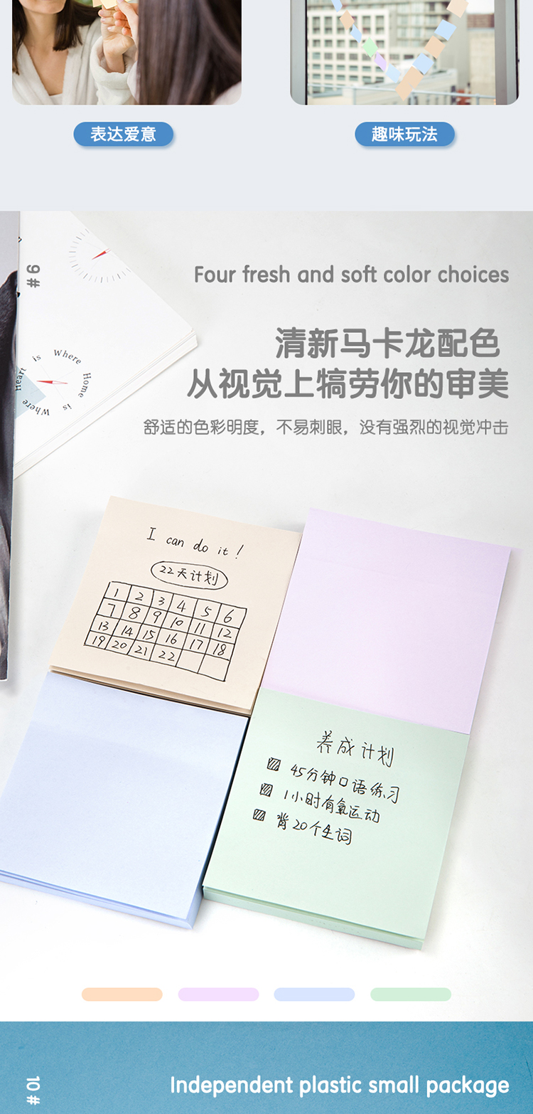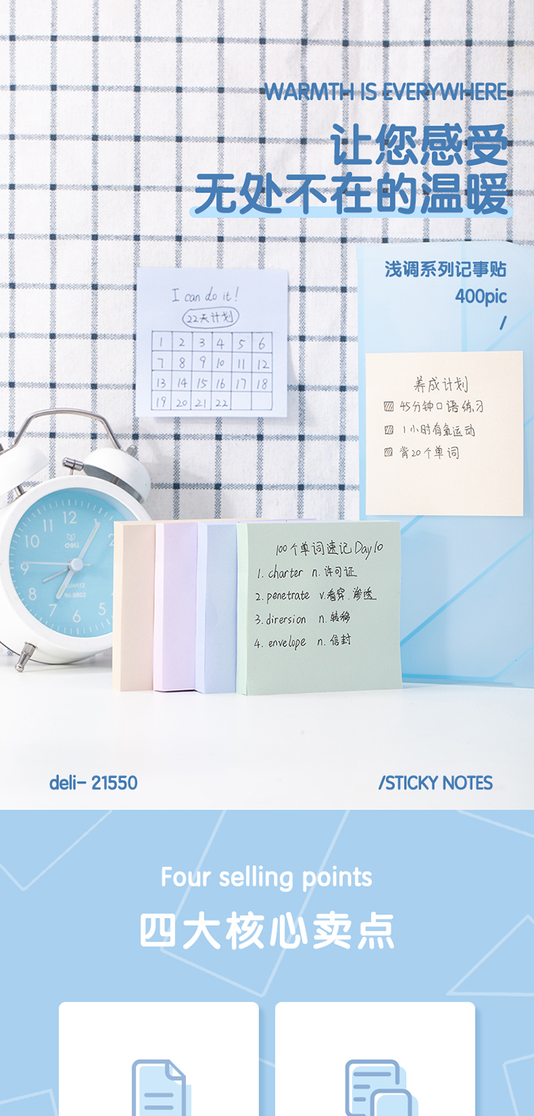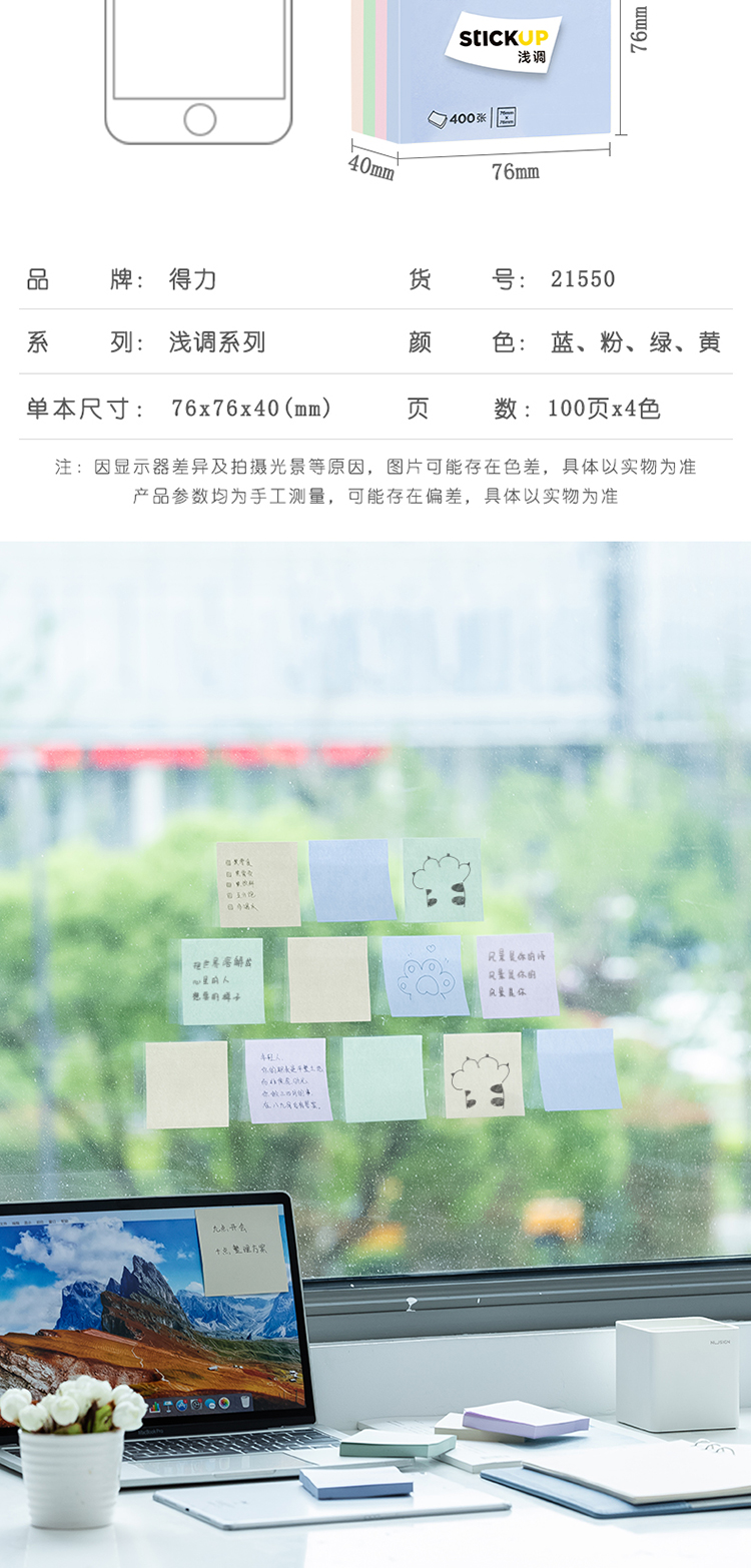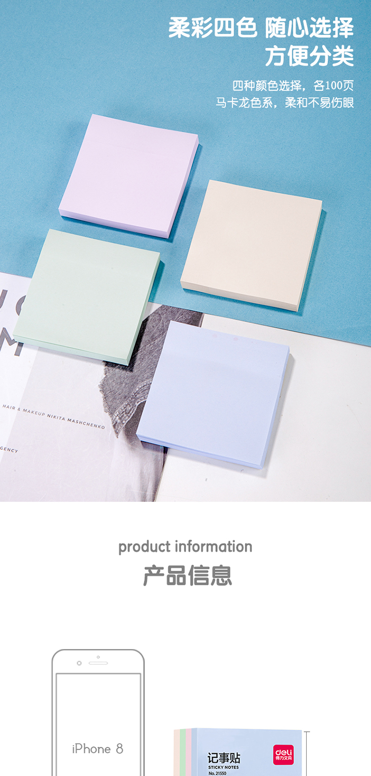 得力(deli)400張4色淺調(diào)系列淡彩簡約便利貼 76*76mm便簽本/記事貼/ 自粘留言本 辦公用品 21550