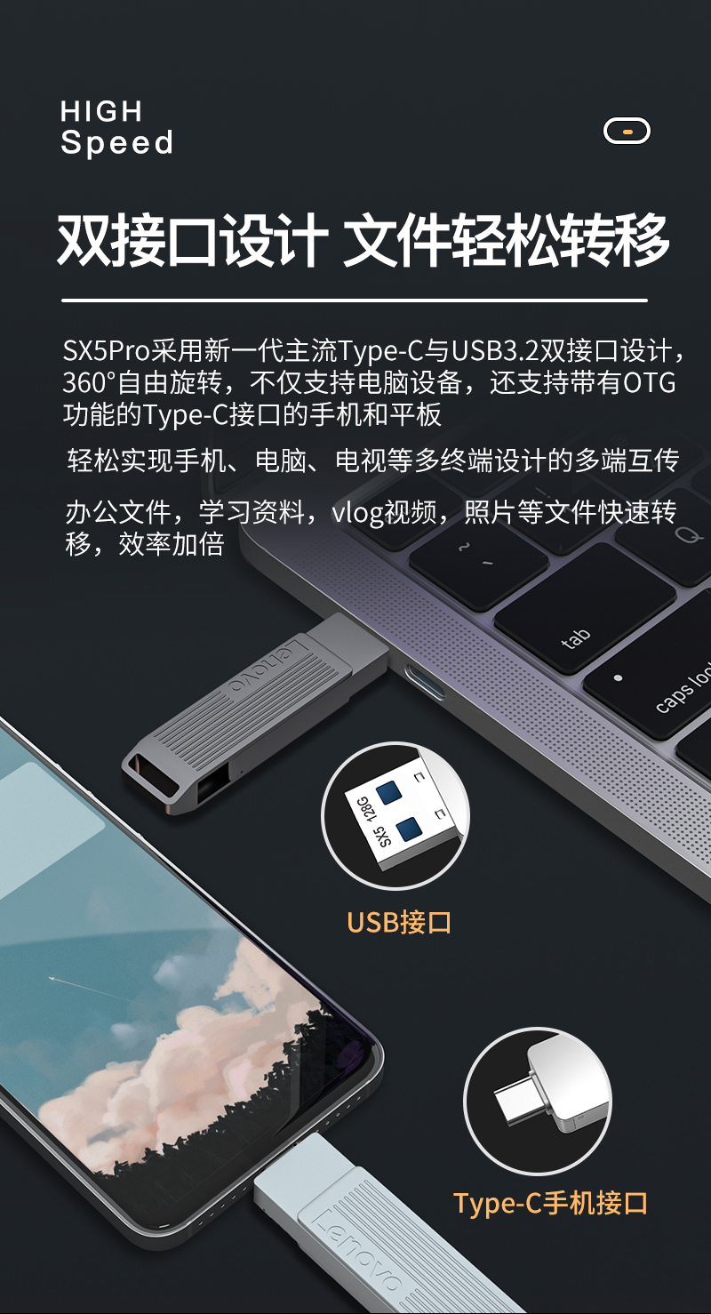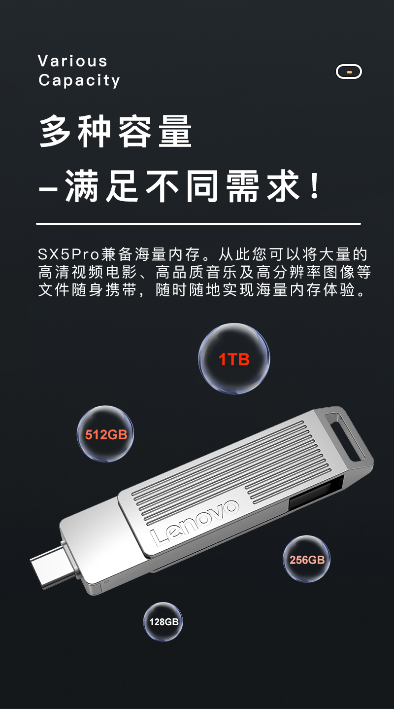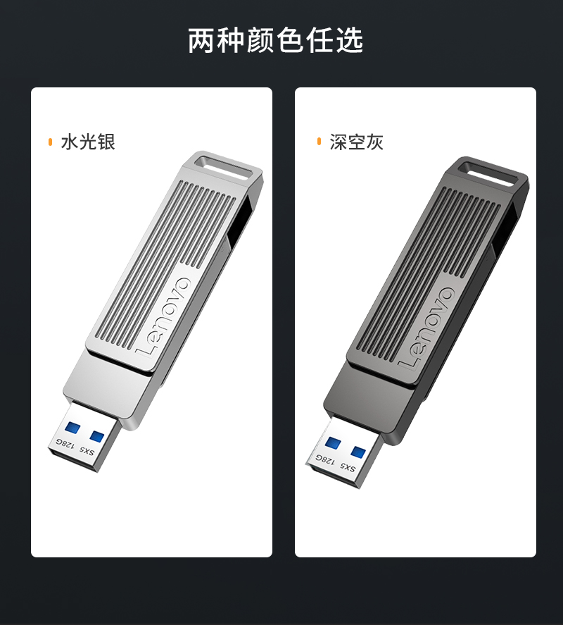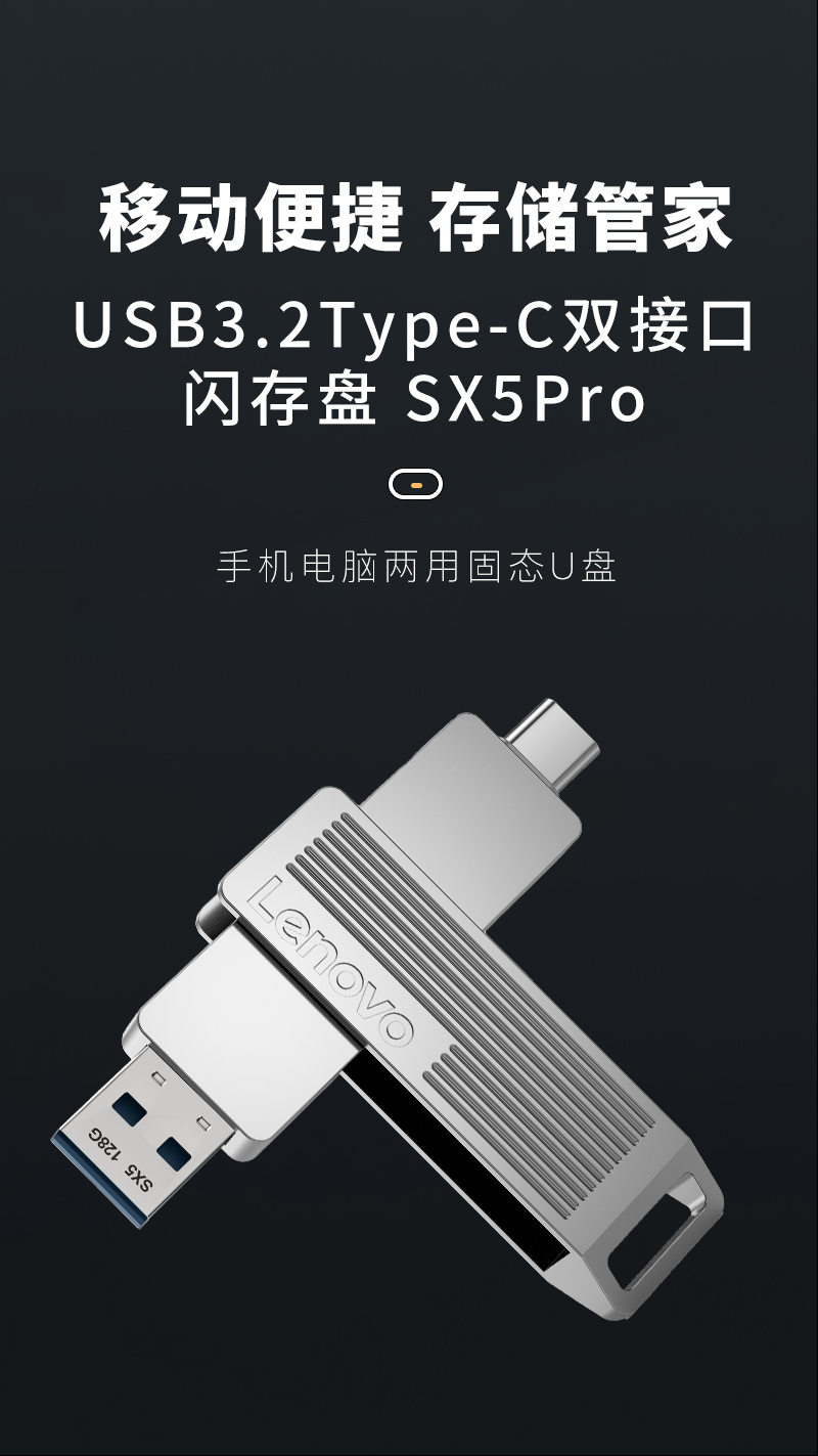 聯(lián)想(Lenovo)256GB u盤 USB3.2/Type-C雙接口 手機電腦兩用 SX5 Pro系列 銀色