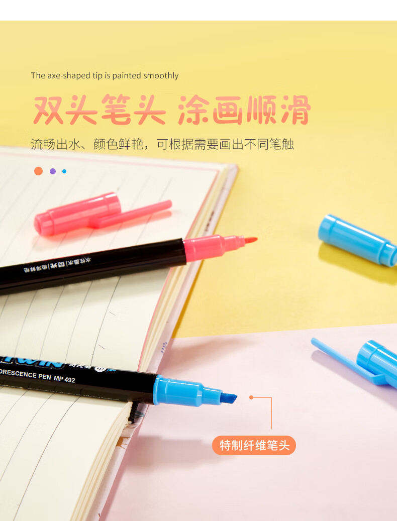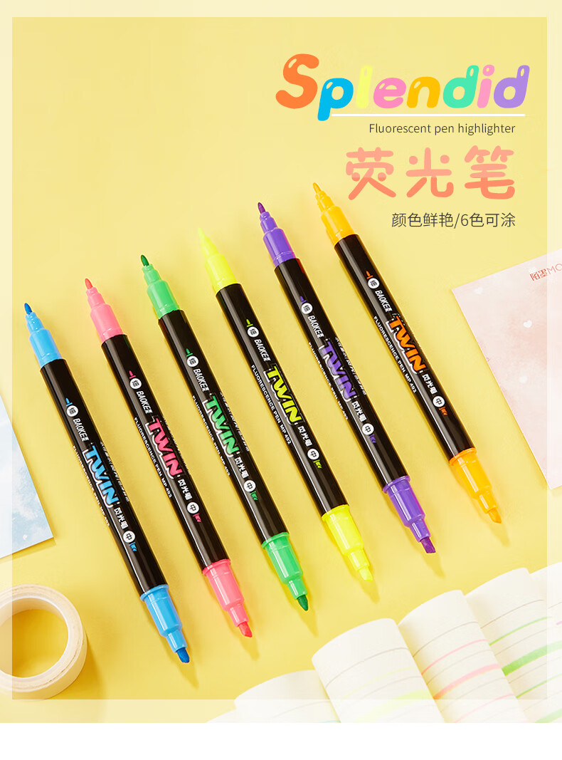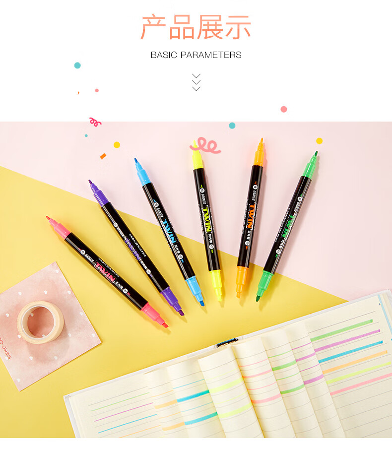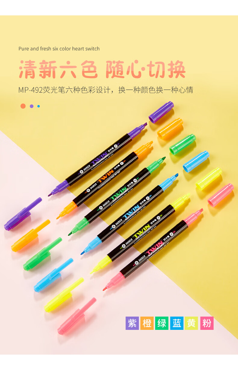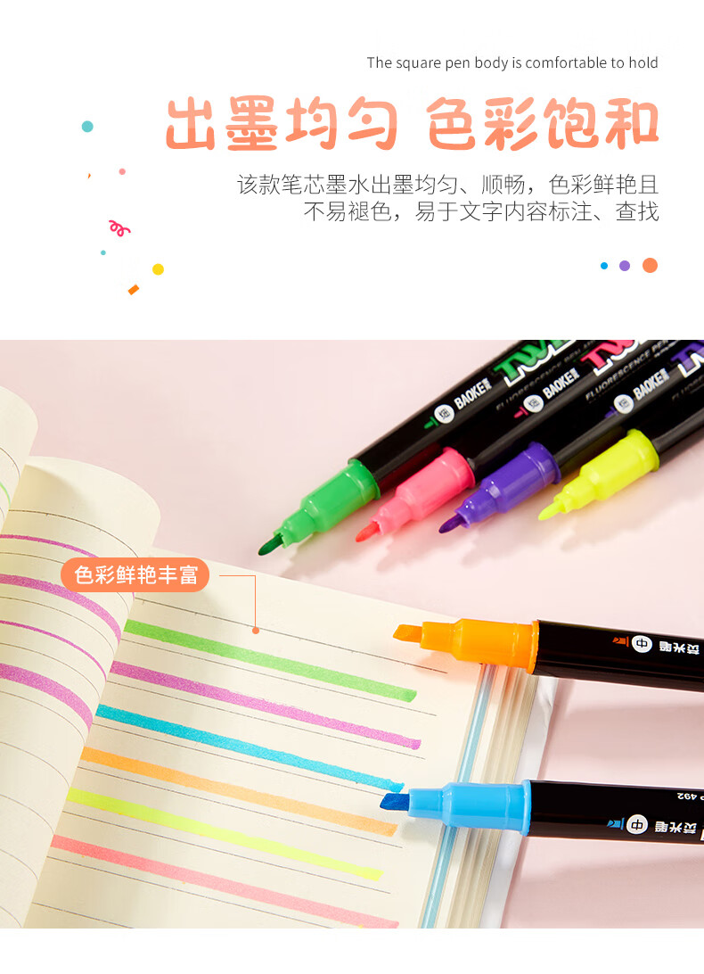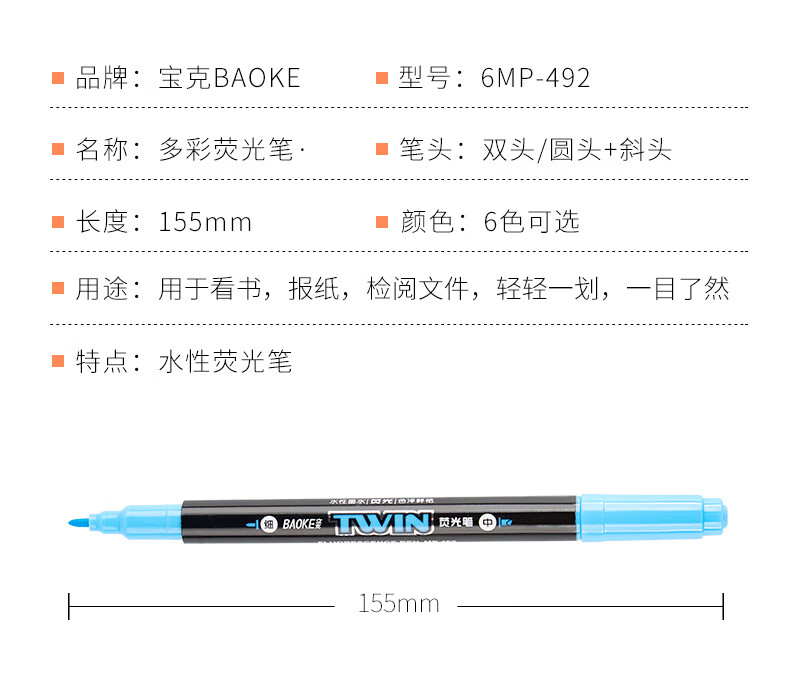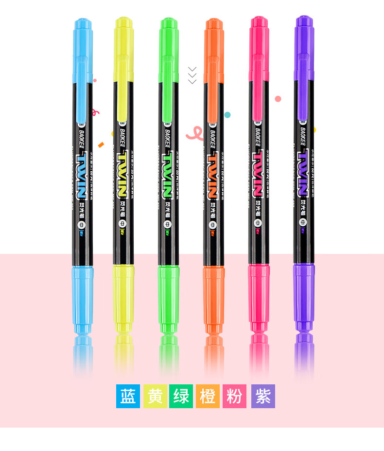 BAOKE寶克MP492粗細雙頭雙色熒光筆黃色藍色粉學生辦公筆記作業(yè)斜頭+圓頭細長桿圓桿簡約便攜文具 6色套裝