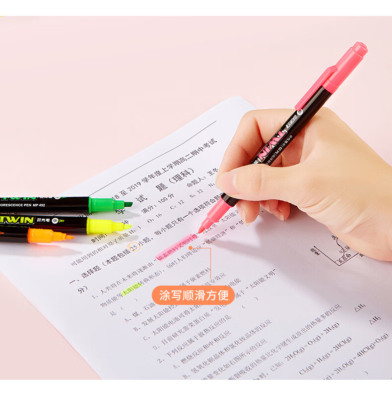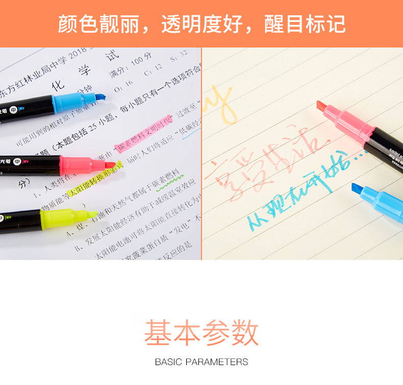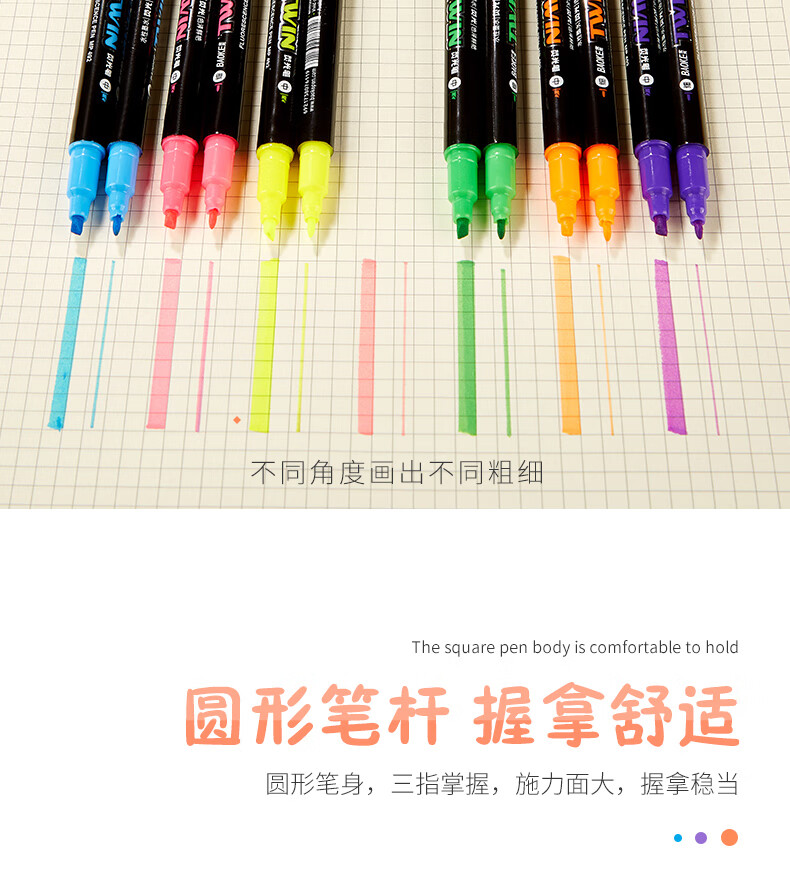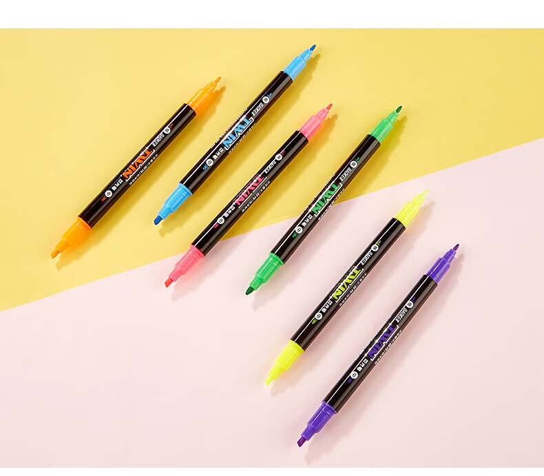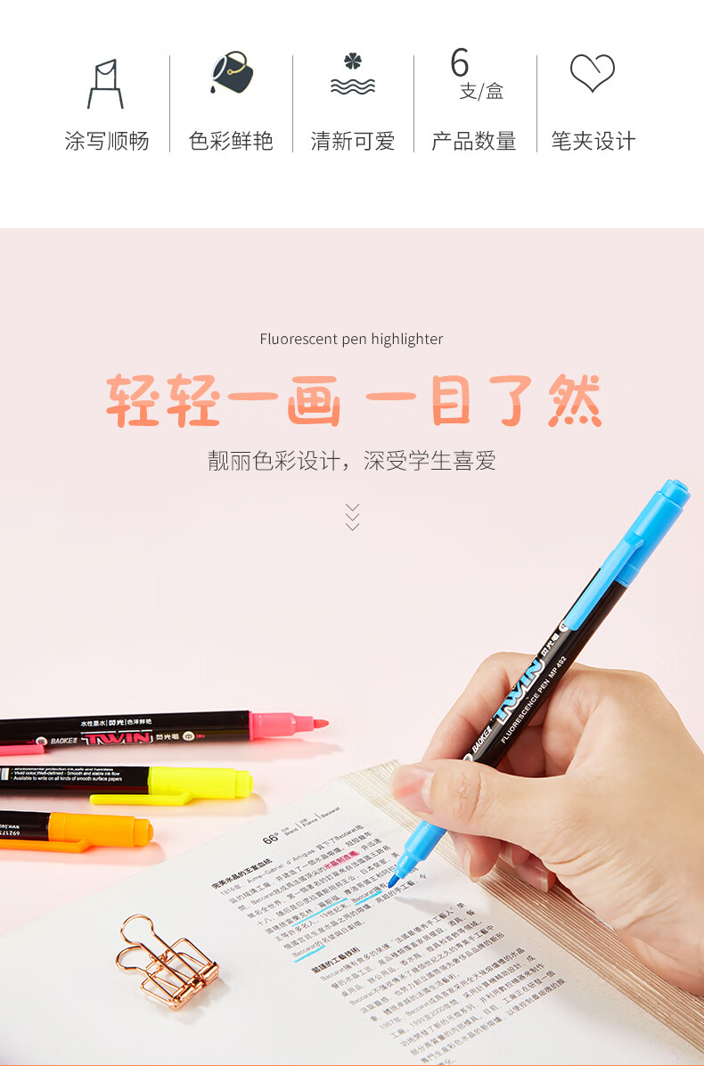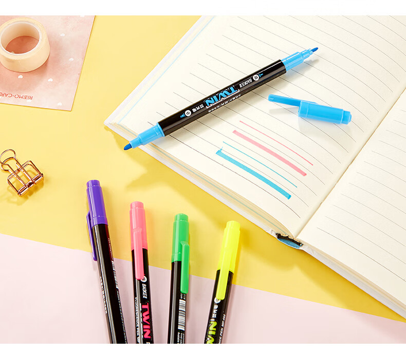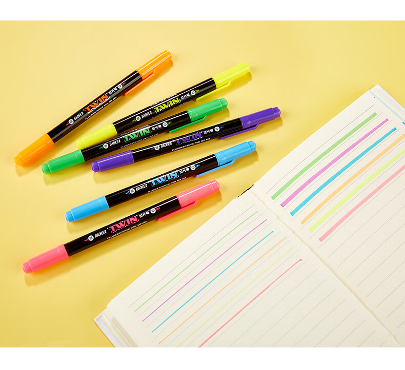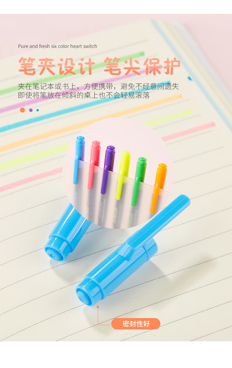BAOKE寶克MP492粗細雙頭雙色熒光筆黃色藍色粉學生辦公筆記作業(yè)斜頭+圓頭細長桿圓桿簡約便攜文具 6色套裝