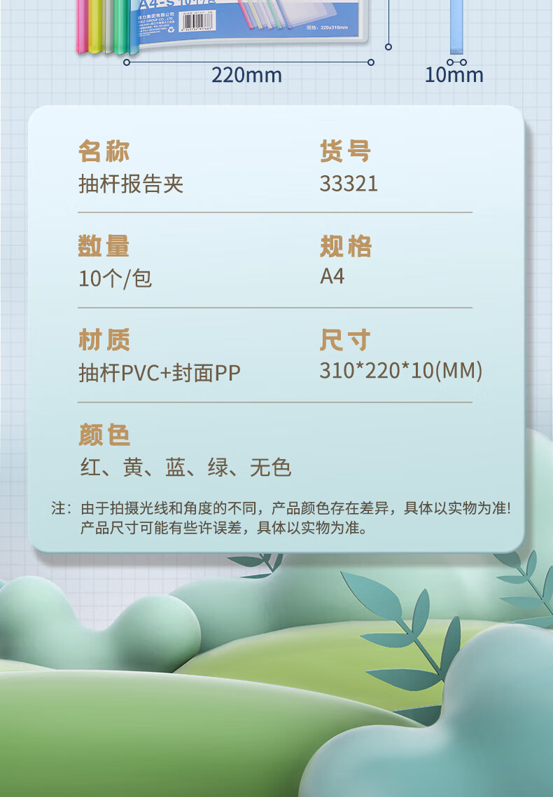 晨光(M&G) AWT90945 A4透明彩色抽桿夾文件夾資料夾標(biāo)書夾 10個(gè)/包 顏色隨機(jī)