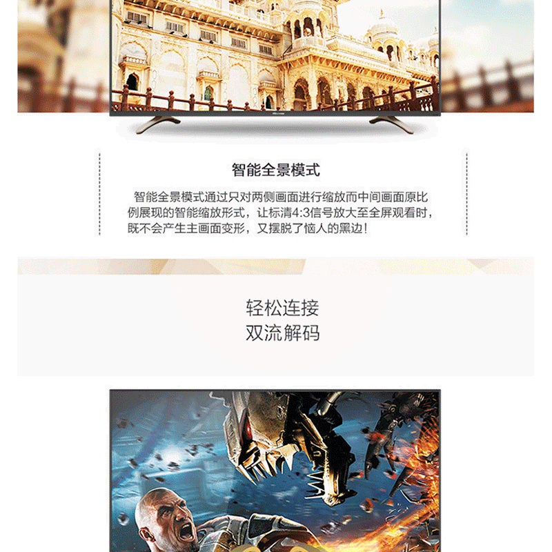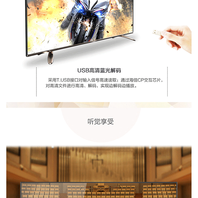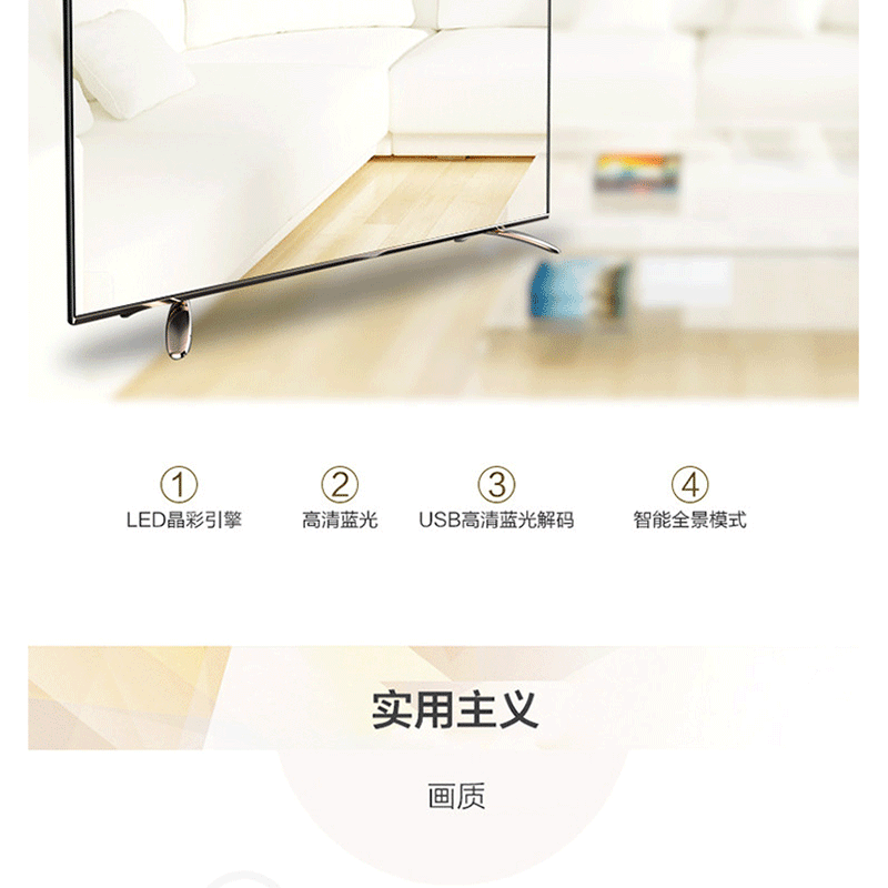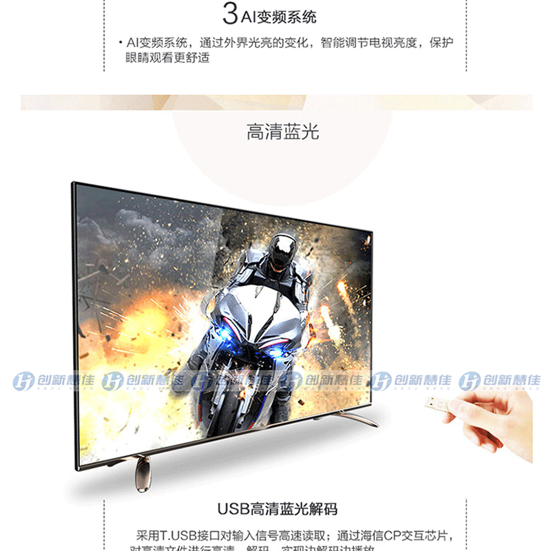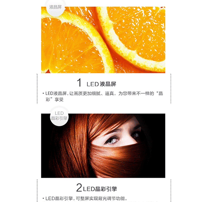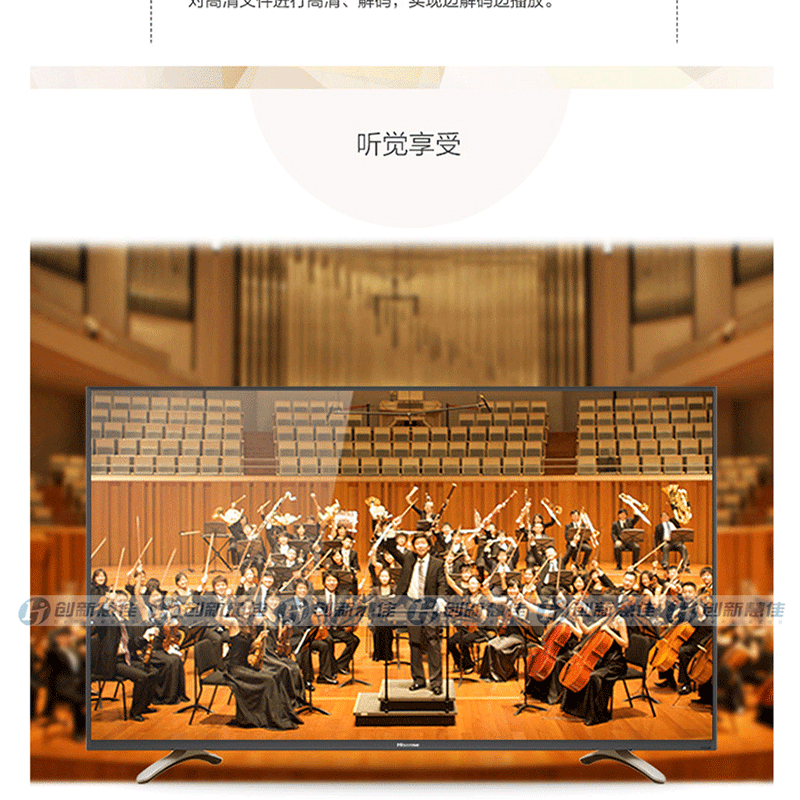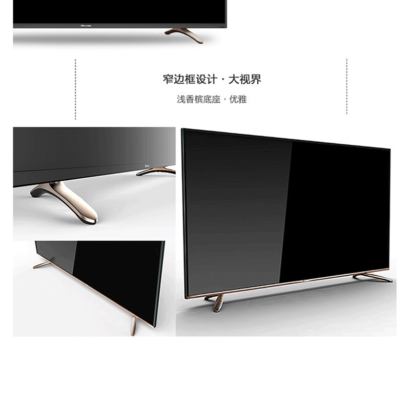 全程高清解碼、藍(lán)光解碼,極窄邊框無限視界、黑色高光注塑工藝、 淺色香檳底座、一體化后殼設(shè)計(jì),立體變頻、圖像分析 ?
