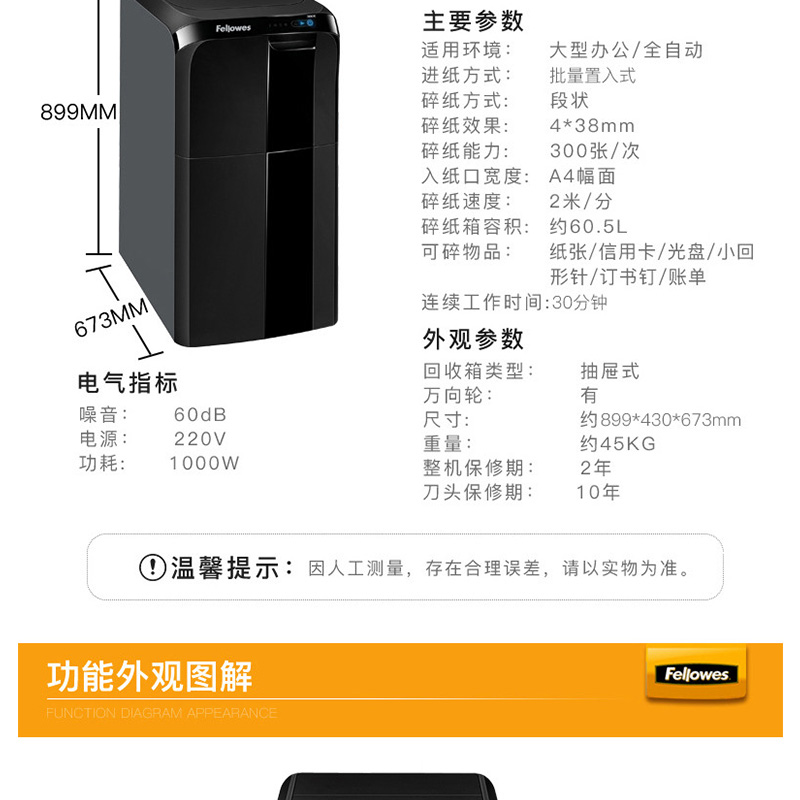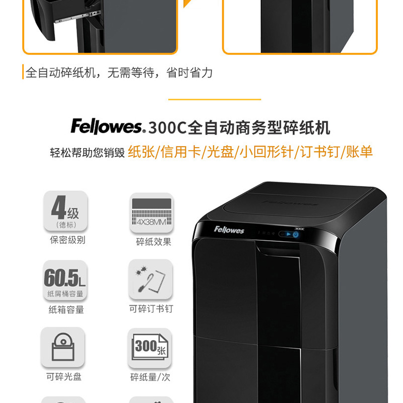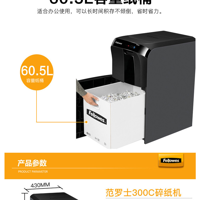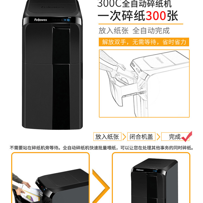 范羅士(Fellowes) 300C 大型商用全自動(dòng)辦公碎紙機(jī)(碎紙快/抽屜式/單次碎紙300張)