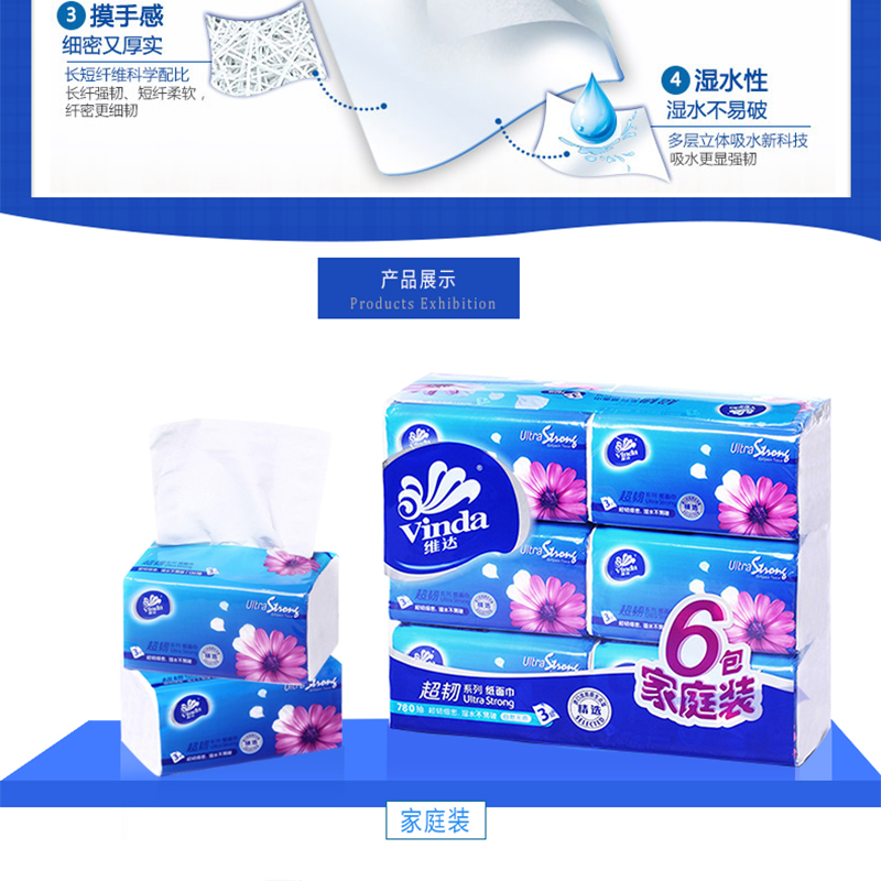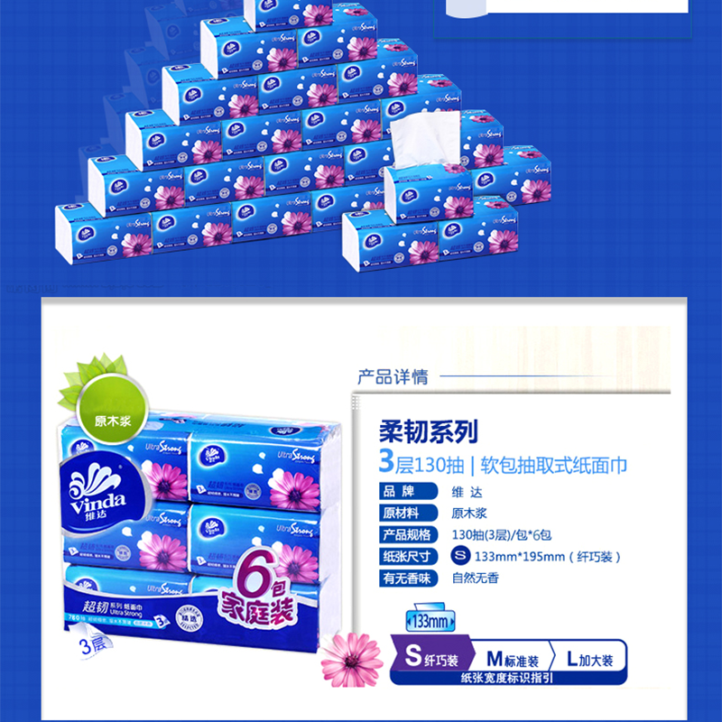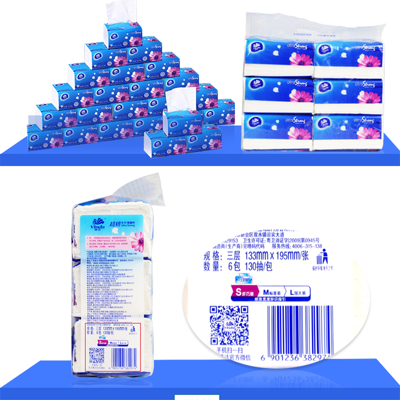 原紙經(jīng)450攝氏度超高溫處理 ,安全衛(wèi)生,100%原生木漿,紙質(zhì)純凈,更柔韌 133*195*3層*130抽*6包/提*8提/箱 ?