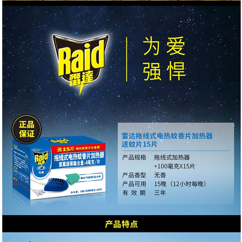 雷達(dá)(Raid) 拖線式電熱蚊香片加熱器 送蚊片15片