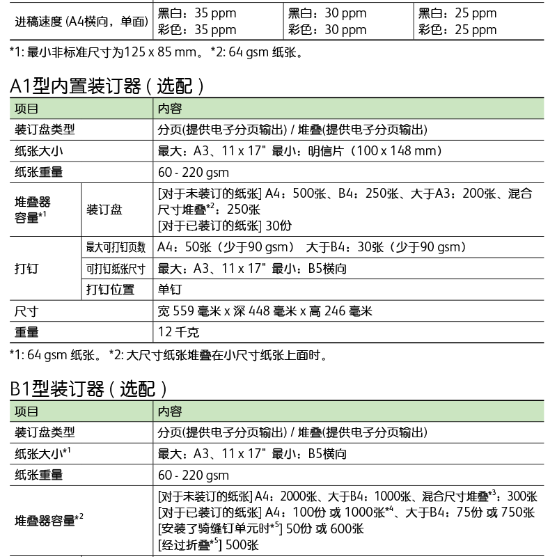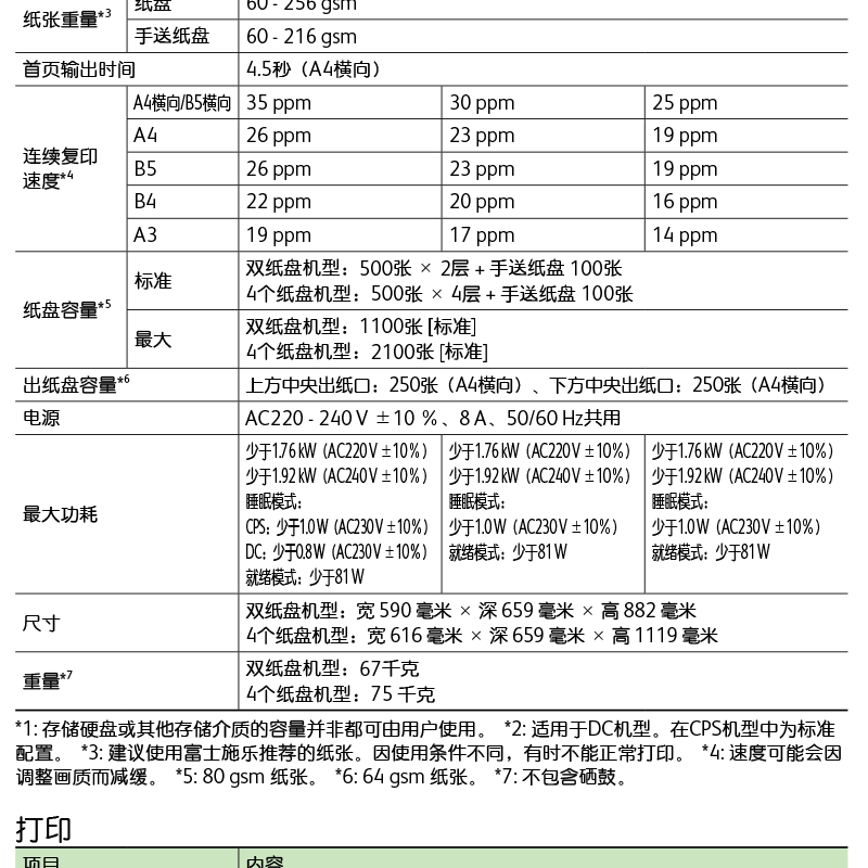 顏色 白色 類別 數(shù)碼復(fù)印機(jī) 品牌 富士施樂(FujiXerox) 認(rèn)證型號 2012010905533886 復(fù)印速度 25/30/35頁/分鐘 首頁復(fù)印時(shí)間 4.5秒(A4橫向) 分辨率 600 x 600 dpi 內(nèi)存容量 4 GB(最大:4 GB) 紙張尺寸 最大 A3、11 x 17" 最小 A5 紙張容量 雙紙盤機(jī)型:500張×2層+手送紙盤100張 紙張重量 紙盤60-256gsm 手送紙盤60-216gsm 體積(寬*深*高) 590 毫米 × 659 毫米 × 882 毫米 連續(xù)復(fù)印張數(shù)(張) 25/30/35頁/分鐘 重量 2Tray-67KG,4Tray-75KG 電源 AC220-240V±10%、8A、50/60Hz