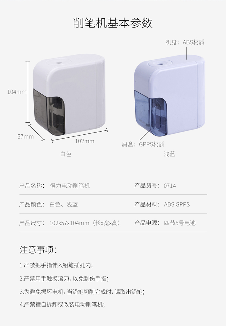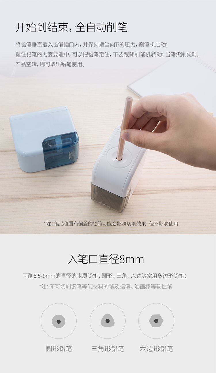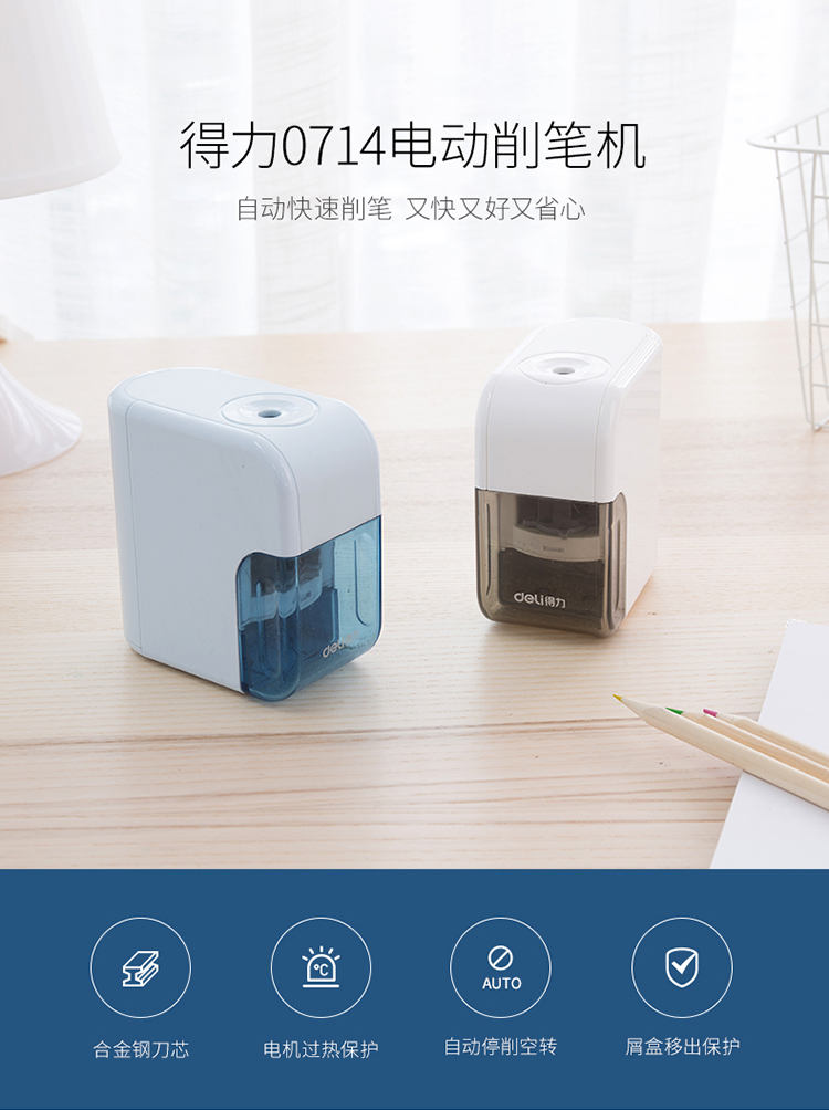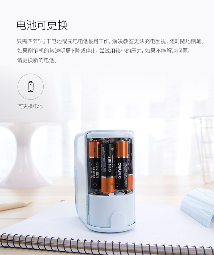 得力(deli) 0714 電池驅(qū)動(dòng)電動(dòng)削筆機(jī) 合金鋼滾刀 適用六角桿/圓桿/三角桿鉛筆 皓月白