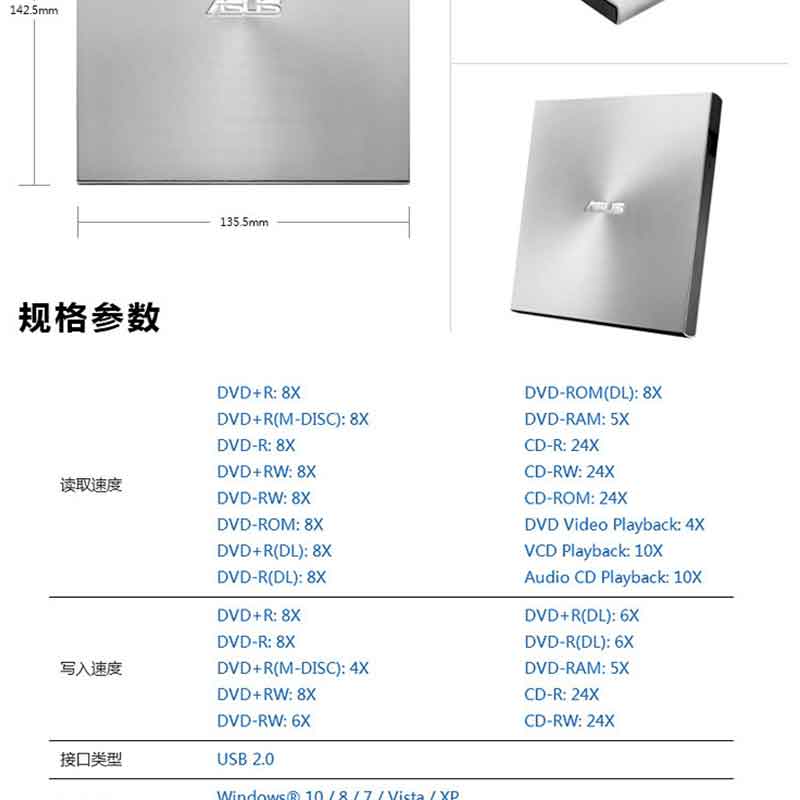 華碩(ASUS) SDRW-08U7M-U 8倍速 USB2.0 外置DVD刻錄機 移動光驅(qū) 銀色(兼容蘋果系統(tǒng))