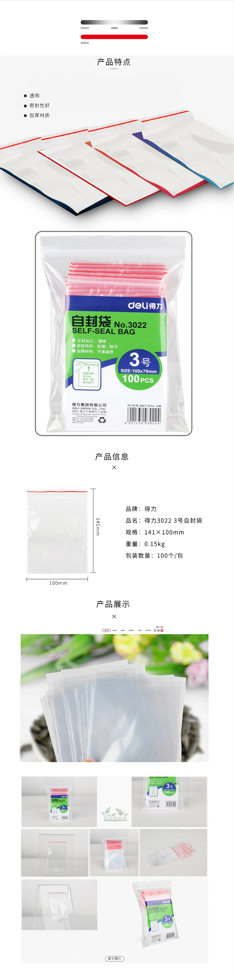 得力(deli) 3022 自封袋(透明)-3號(100個/包)100x70mm0.04mm