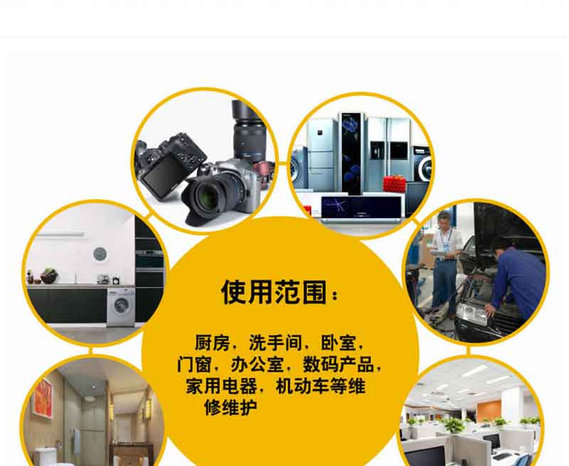 使用范圍:廚房、洗手間、臥室、門(mén)窗、辦公室、數(shù)碼產(chǎn)品、家用電器、機(jī)動(dòng)車(chē)等維修維護(hù) ?