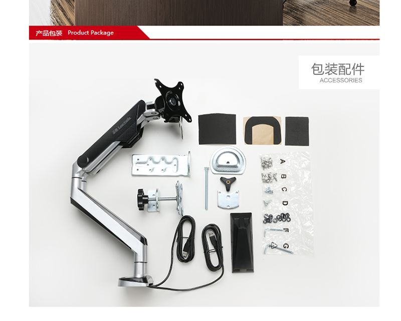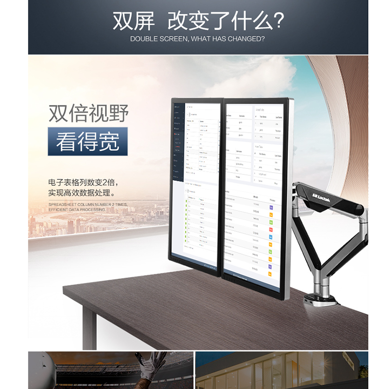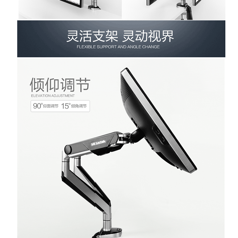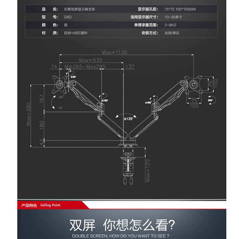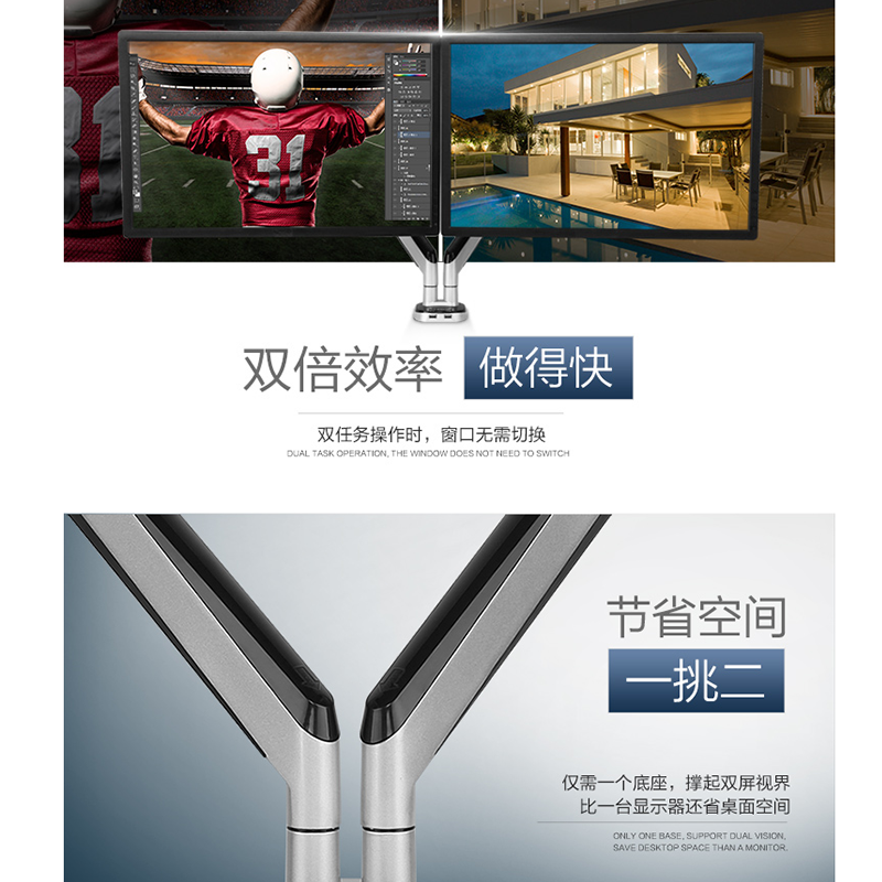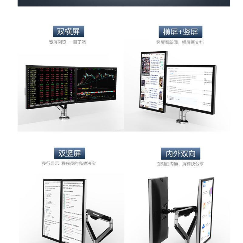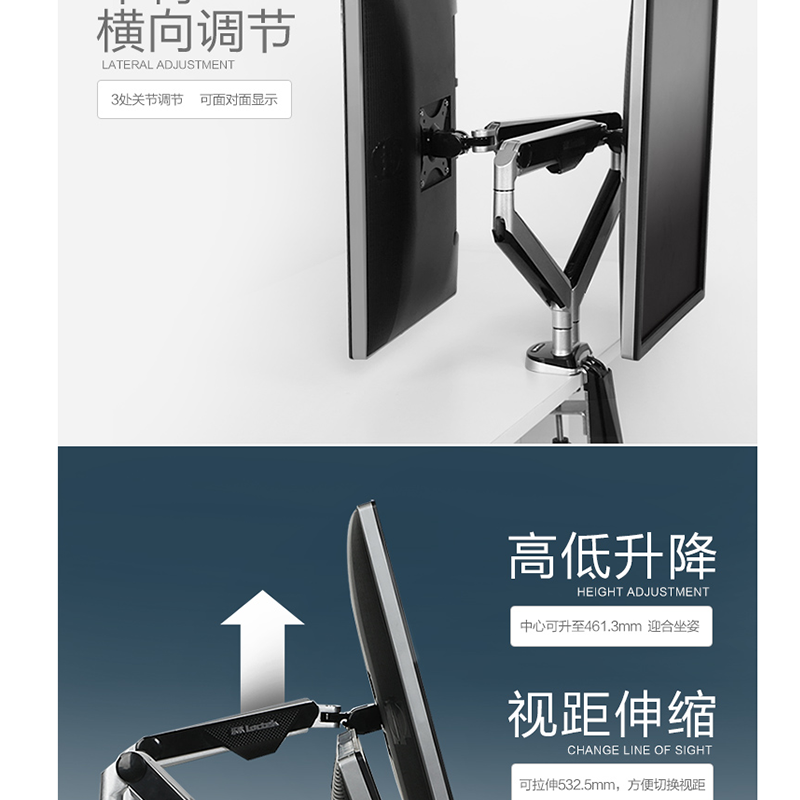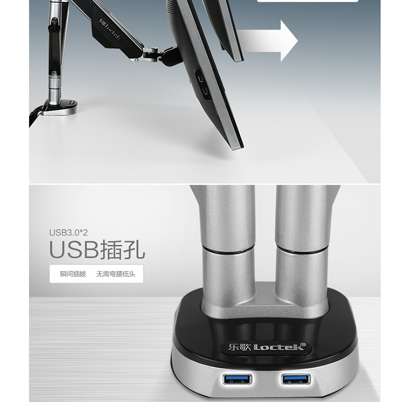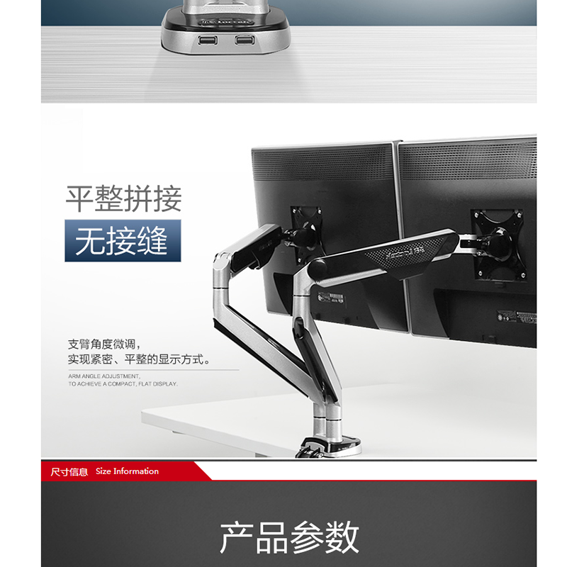 適用17-32英寸,雙屏多樣組合,鋁合金支臂,伸縮旋轉(zhuǎn),USB接口 ?