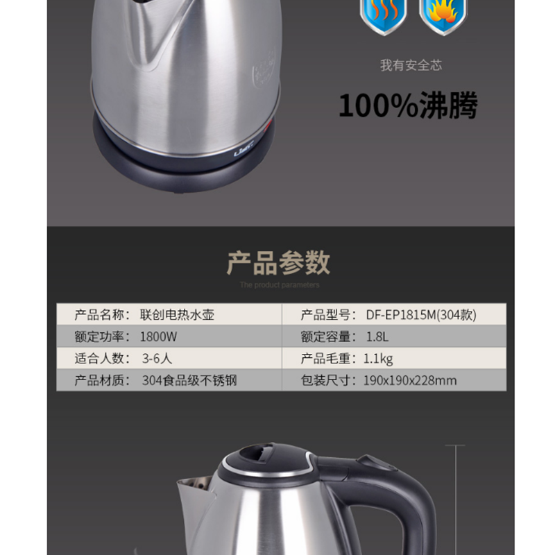 聯(lián)創(chuàng)(Lianc) DF-EP1815M 不銹鋼電熱水壺 1.8L
