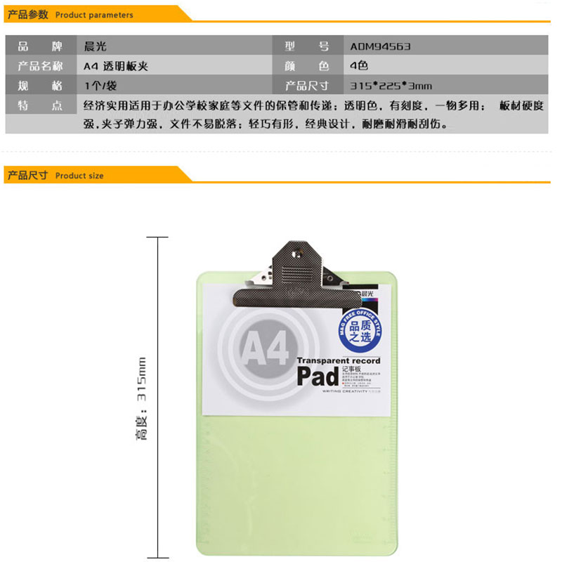 晨光(M&G) ADM94563 A4透明刻度尺記事板夾文件夾 顏色隨機(jī)