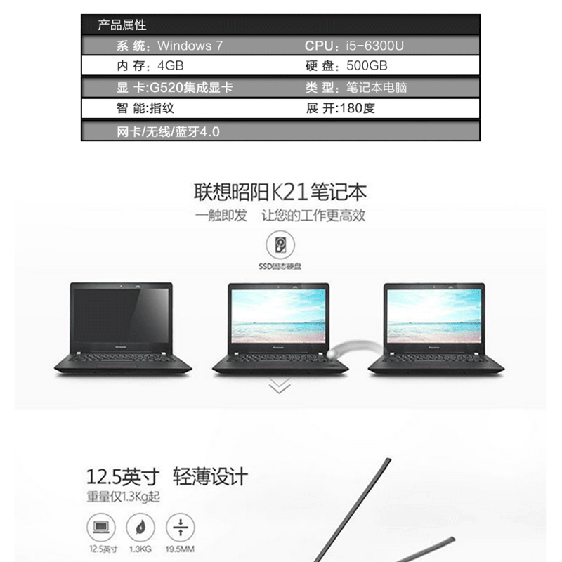 聯(lián)想(Lenovo) 昭陽K21-80 商務(wù)筆記本電腦(i5-6300U)4G內(nèi)存 500G硬盤 集成顯卡/12.5英寸