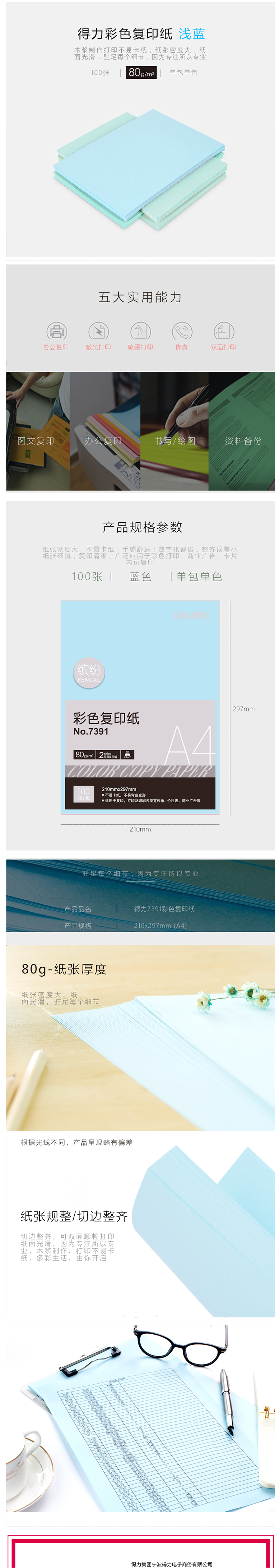 得力(deli) 7391 彩色復(fù)印紙 A4/80g 100張/包(淺藍(lán))