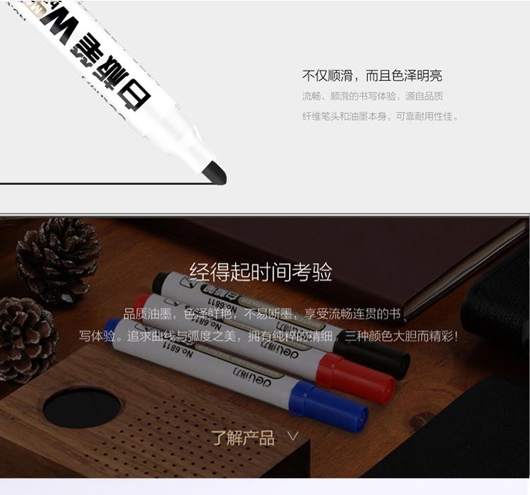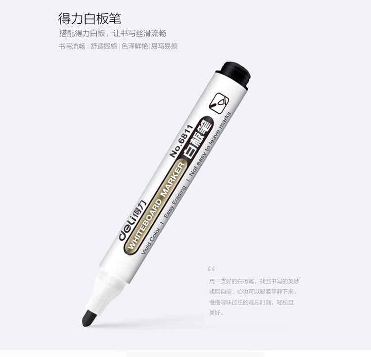 這是一支你值得品鑒的白板筆。纖維筆頭耐磨,不易變形。擦拭不留痕,書寫線副2.0mm。 ?