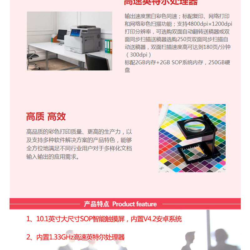 網(wǎng)絡(luò)打印,自動(dòng)雙面打印,20頁/分鐘,10.1英寸大尺寸SOP智能觸摸屏,內(nèi)置V4.2安卓系統(tǒng) ?