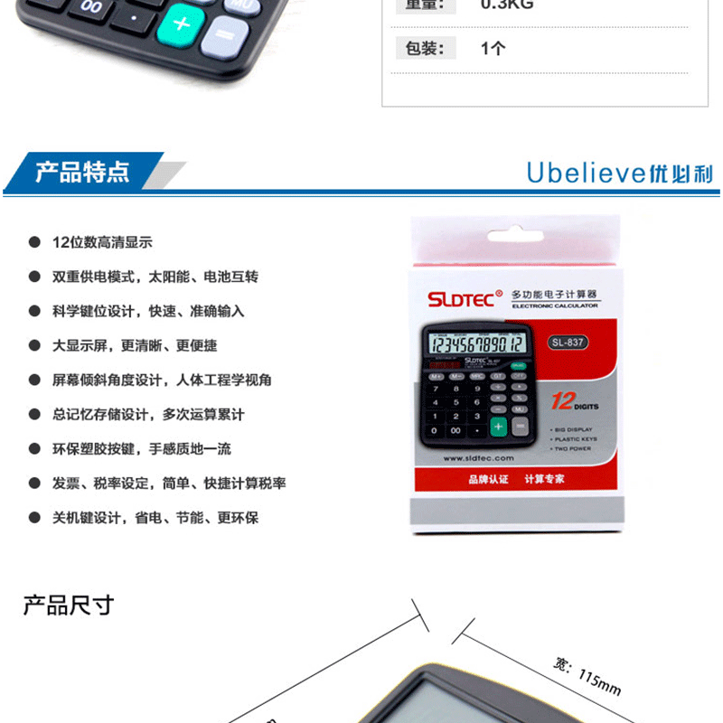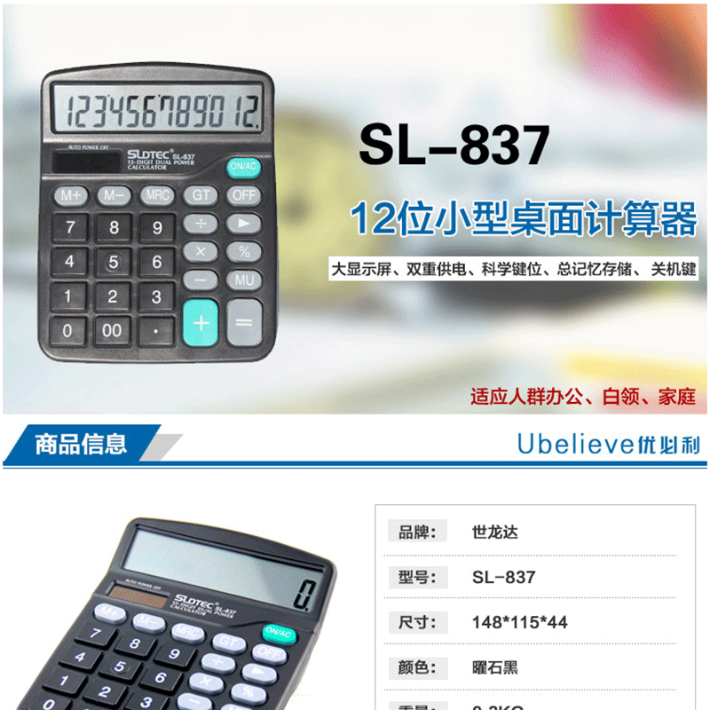 世龍達(dá)((SLDTEC)) SL-837 大顯示屏雙重電源辦公計(jì)算器