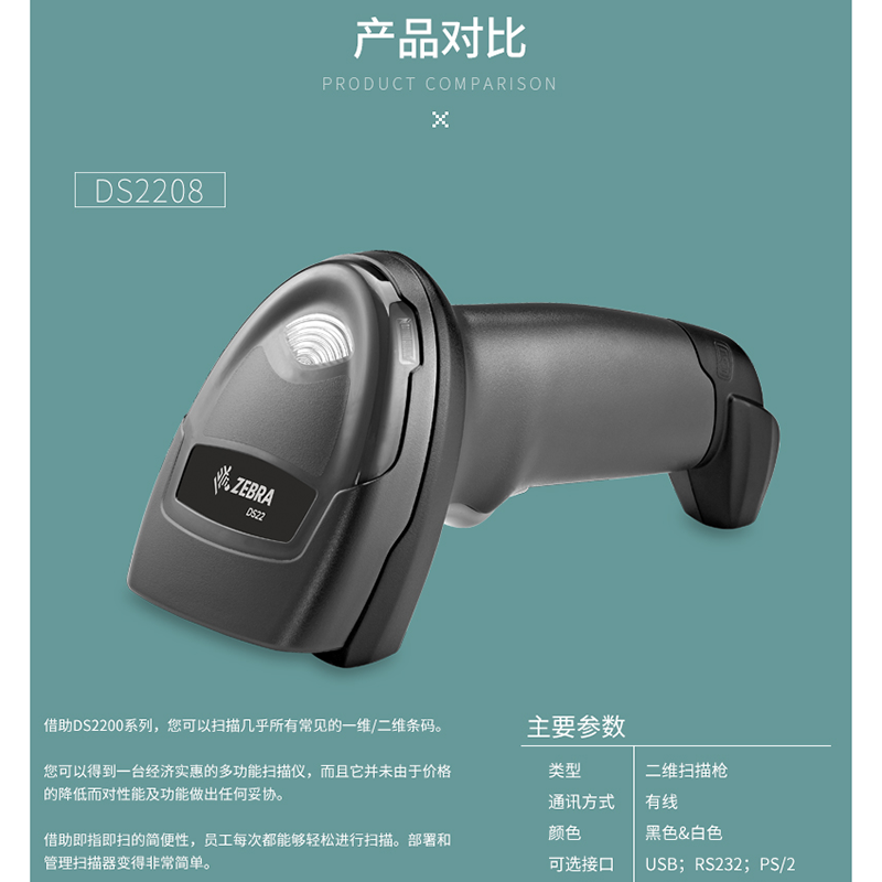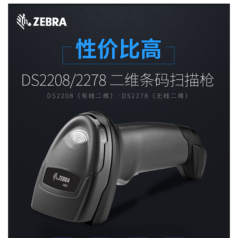 斑馬(ZEBRA) DS2208 二維碼/條碼掃描槍 微信支付寶收銀 (白色帶架套裝)