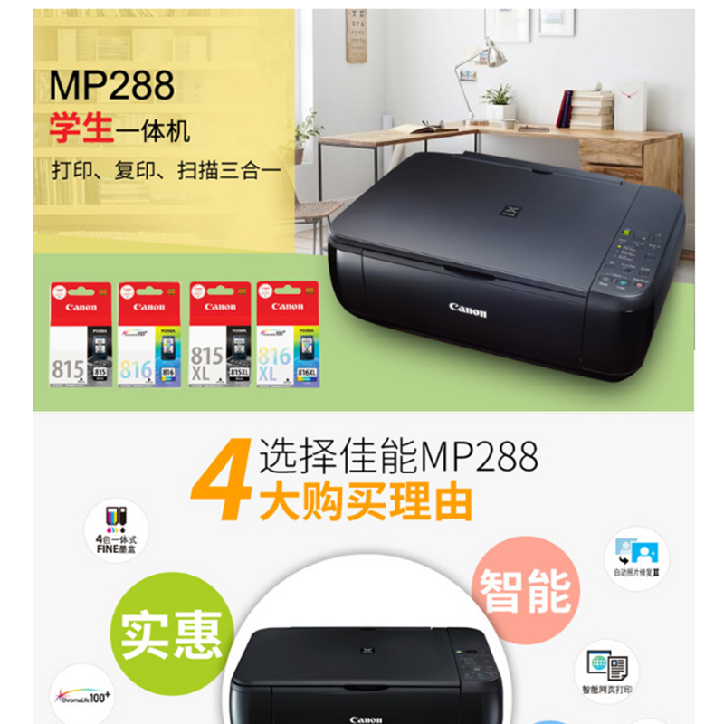 佳能(Canon) MP288 彩色噴墨多功能一體機(jī) (打印速度黑8.4ipm/彩4.8ipm)