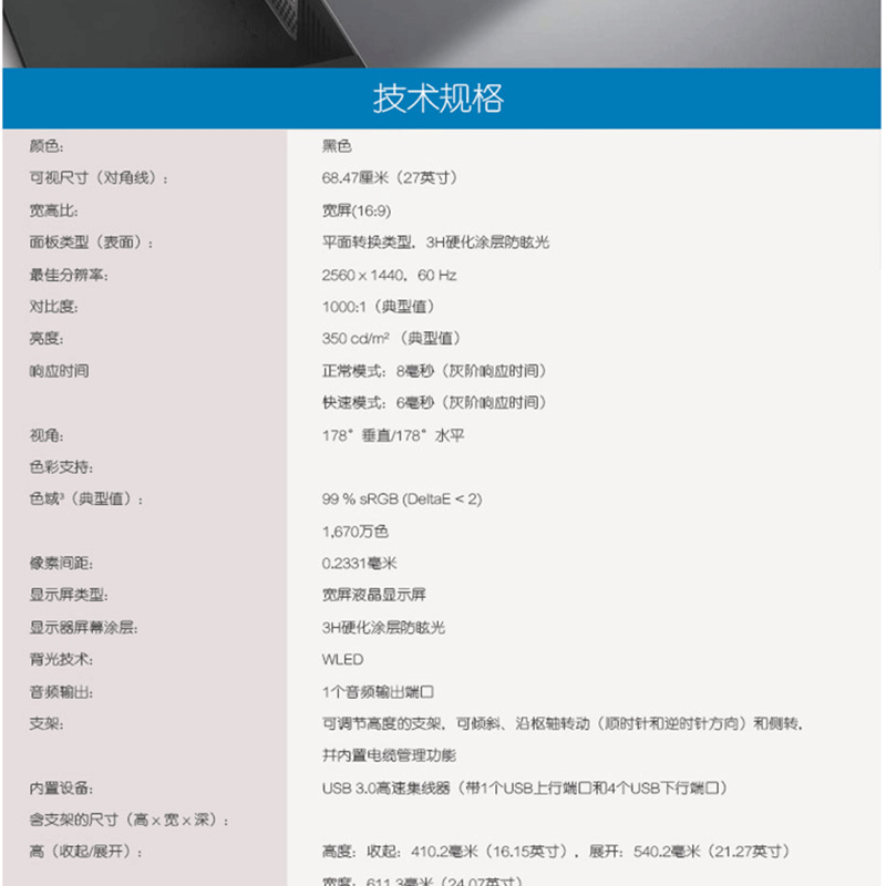 戴爾(DELL) U2717D 27英寸四面超窄邊2K超高清旋轉(zhuǎn)升降IPS屏顯示器