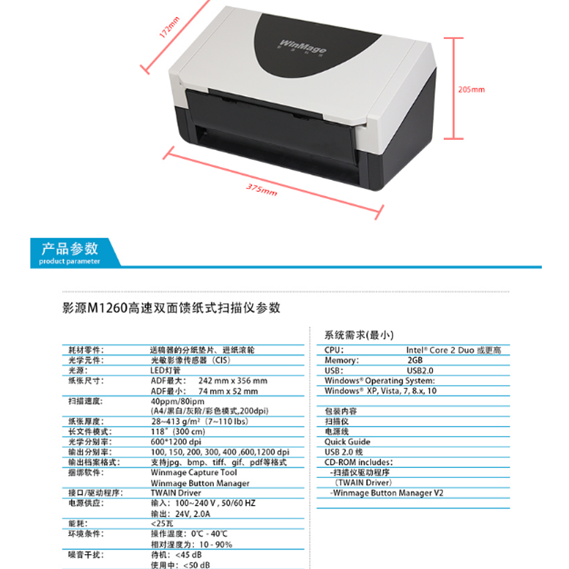 影源(WinMage) M1260 A4饋紙式掃描儀 高速文檔 雙面自動進紙 (40頁80面/分鐘)