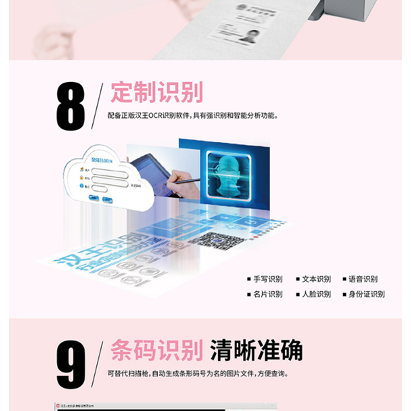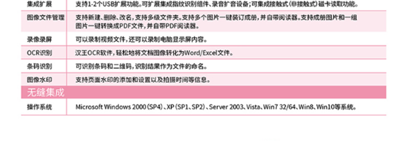 可集成擴(kuò)展、支持一鍵證件合成、可識別條碼和二維碼、支持頁面水印添加、可錄像錄屏、一鍵Word或PDF 漢王專注識別28年 ?