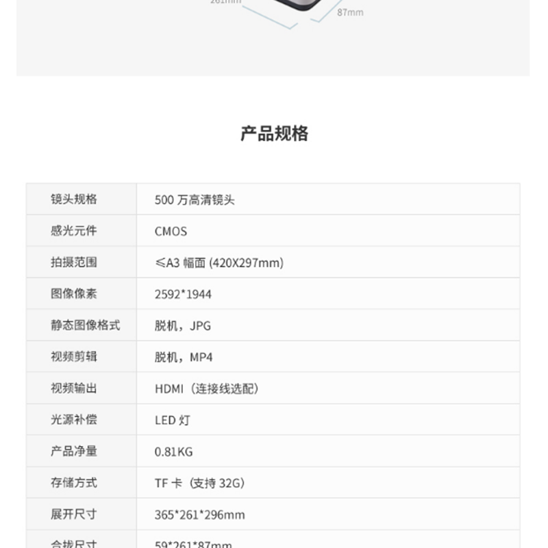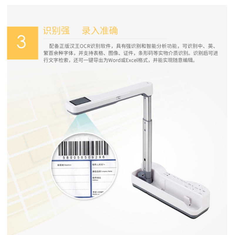 支持脫機(jī)使用、自帶TFT液晶屏可視頻錄制智能補(bǔ)光、折疊便攜式掃描儀、自帶鋰電池讀卡功能、一鍵Word或PDF 漢王專注識(shí)別28年 ?