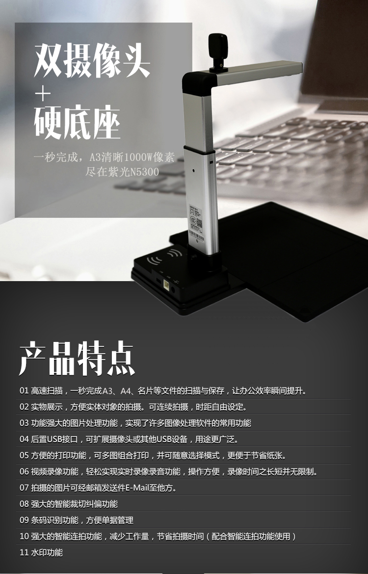 紫光(UNIS) N5300 高拍儀/雙攝像頭掃描儀 硬底座 (1000萬+200萬像素)