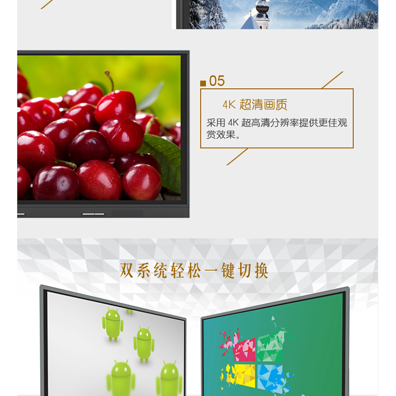 • 55英寸,2K屏體 65英寸,4K屏體 75英寸,4K屏體 86英寸,4K屏體