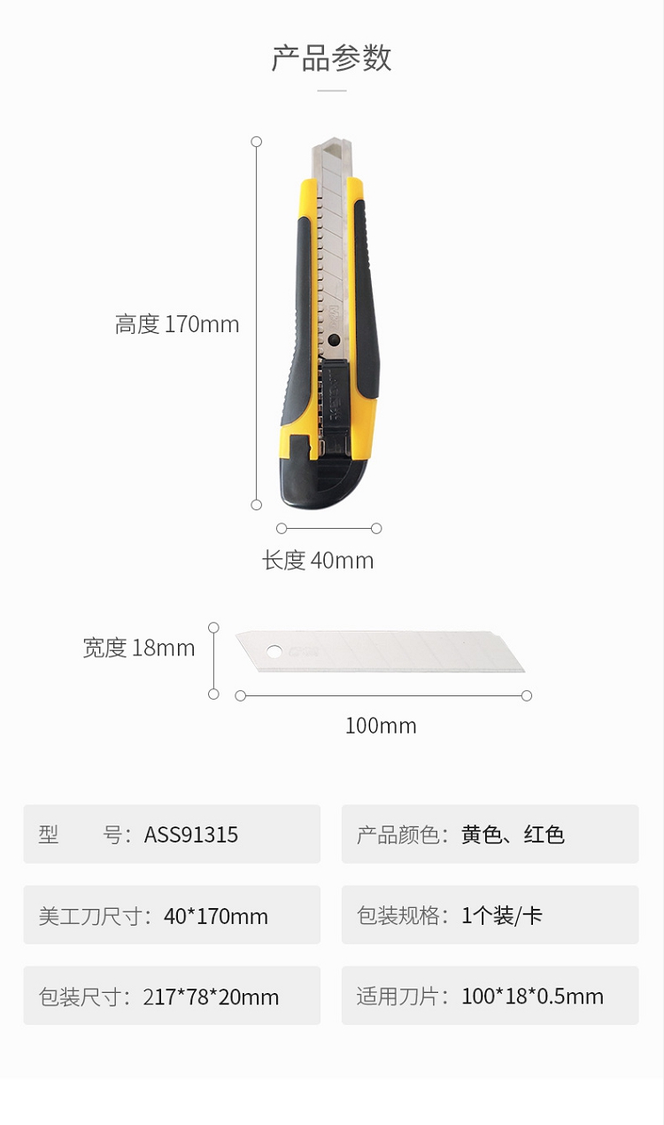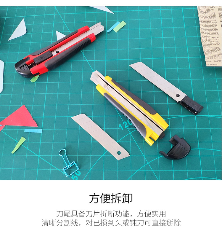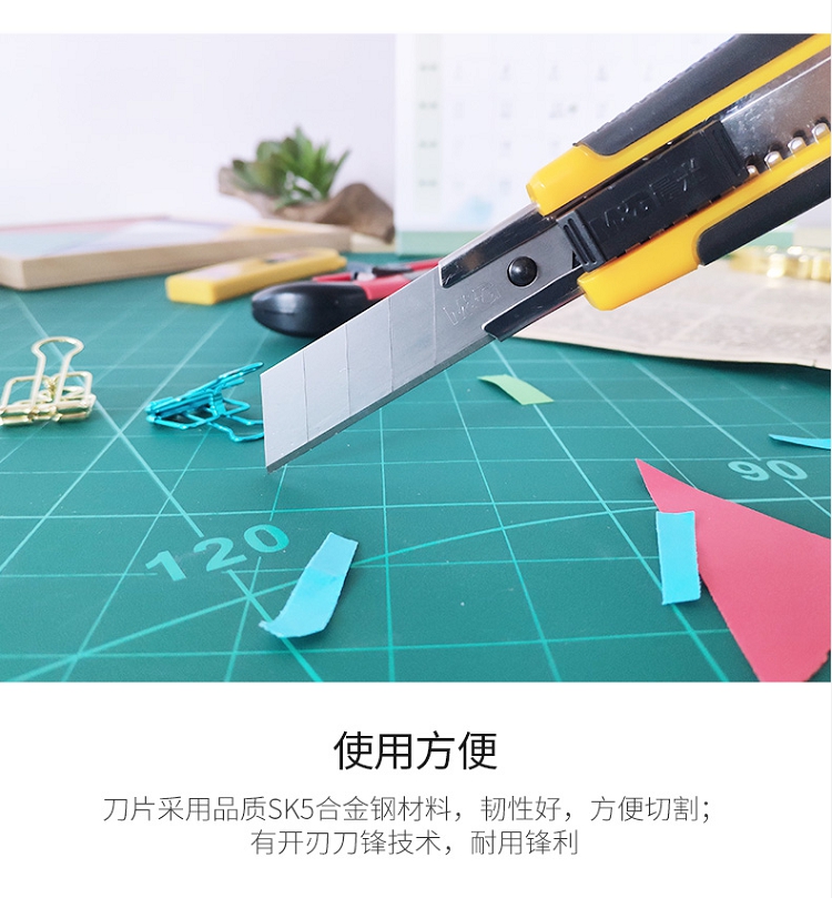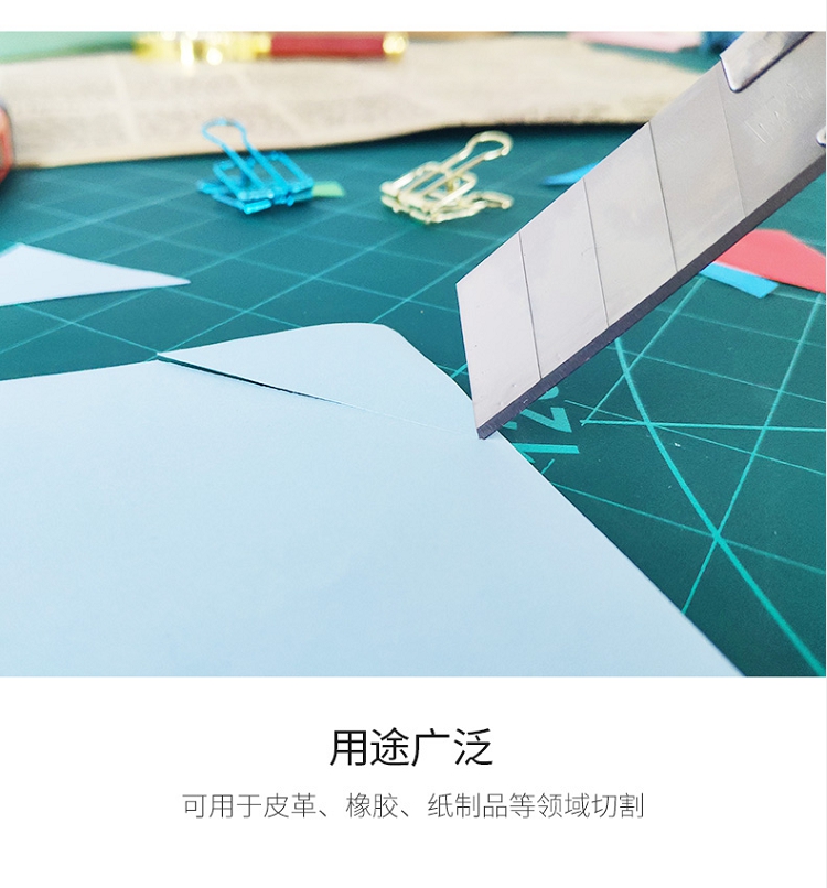殼采用鋁合金加塑料打造,刀片由碳素工具鋼制成;軟體手柄,刀尾附帶折刀器,金屬外殼下附送刀片。 ?