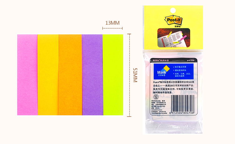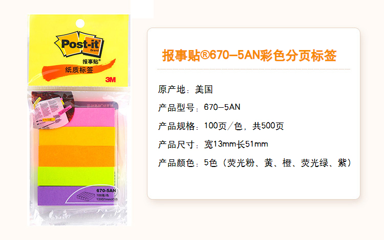 3M(Post-it) 670-5AN 熒光指示標(biāo)簽/報(bào)事貼/分頁(yè)標(biāo)簽 13×51mm 100張*5色/包