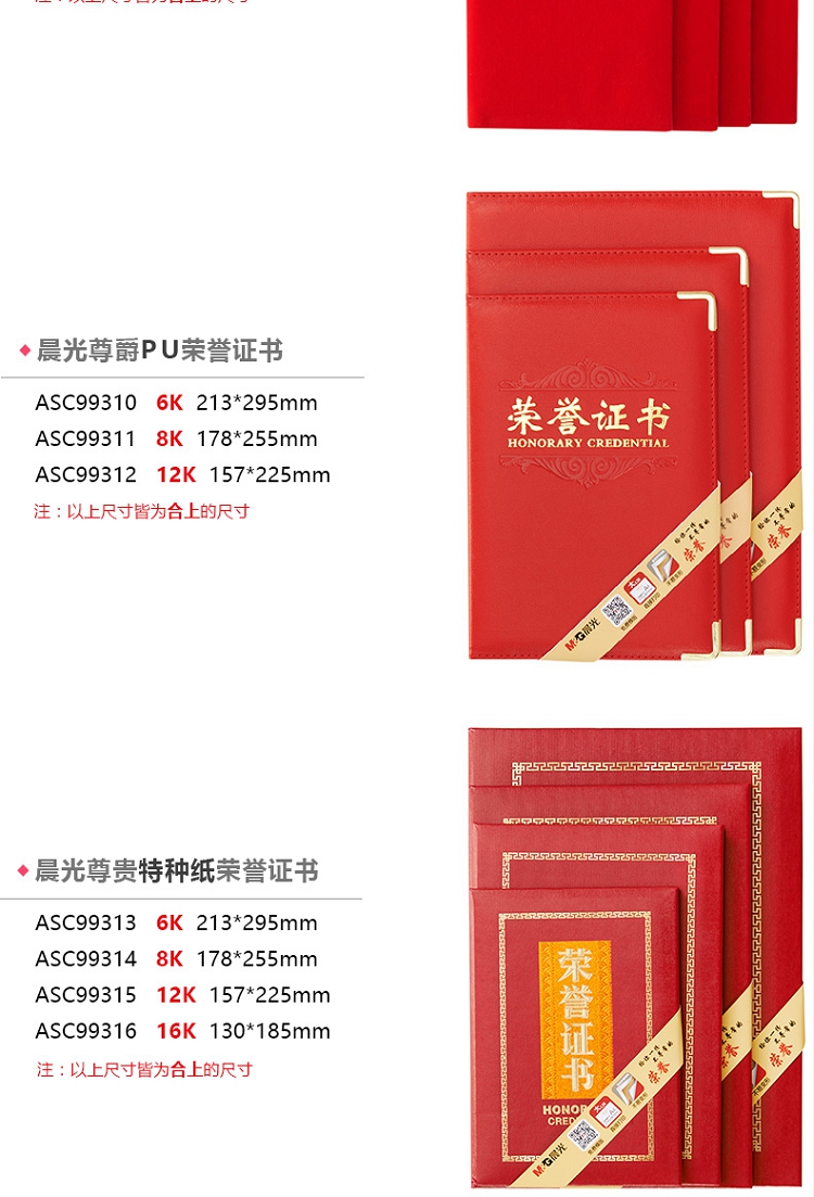 晨光(M&G) ASC99312 12K PU皮面榮譽證書(合上尺寸157*255mm)