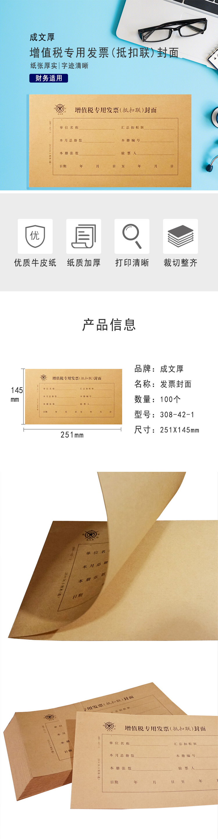 成文厚 308-42-1 增值稅專用發(fā)票(抵扣聯(lián))封面 21K(250*145mm) 50份/包