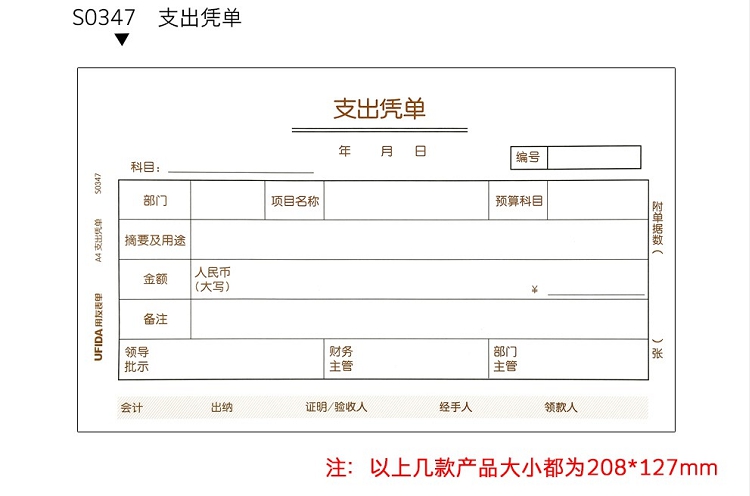 用友(UFIDA) S0347 /A4支出憑單 208*127mm 5本/包