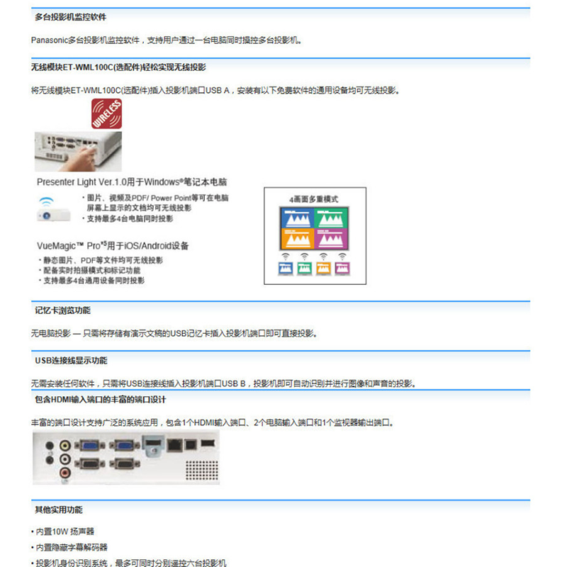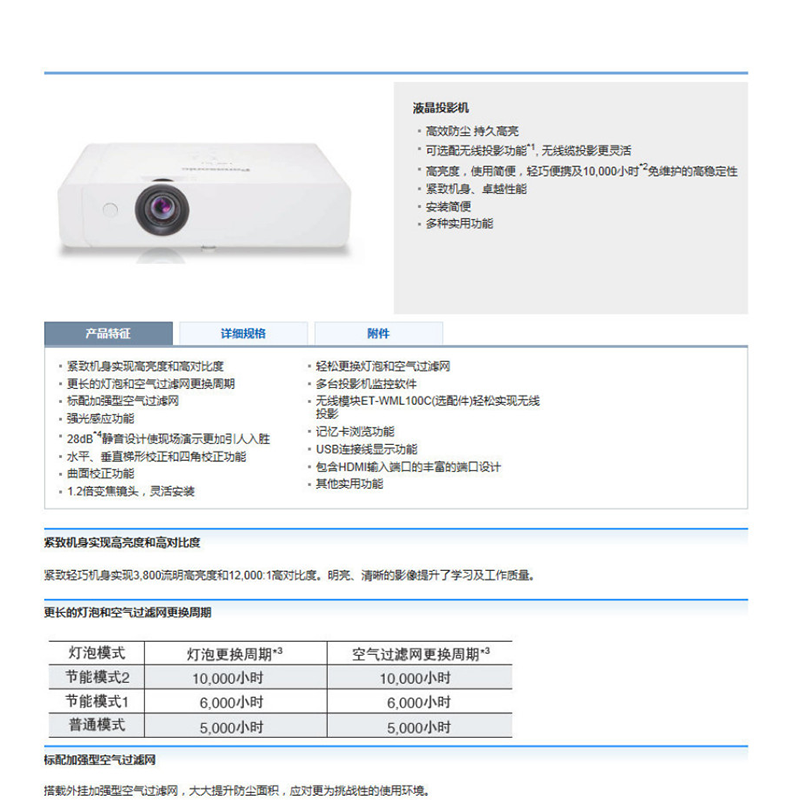 可選配件 高天花板吊架ET-PKL100HC,低天花板吊架ET-PKL100SC,支架組件ET-PKL420BC,D-SUB/S-視頻轉(zhuǎn)換線ET-ADSVC,替換過(guò)濾網(wǎng)單元ET-RFL310C,替換燈泡單元ET-LAL500C,無(wú)線模塊ET-WML100C 其他功能 強(qiáng)光感應(yīng)功能,曲面校正功能,輕松更換燈泡和空氣過(guò)濾網(wǎng),多臺(tái)投影機(jī)監(jiān)控軟件,標(biāo)配加強(qiáng)型空氣過(guò)濾網(wǎng)