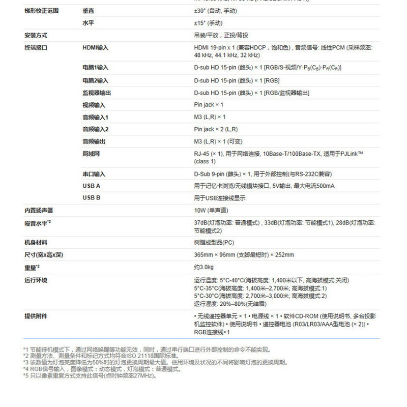 重量(kg) 約3kg 標(biāo)準(zhǔn)配件 無(wú)線遙控器單元×1,電源線×1,軟件CD-ROM(使用說(shuō)明書, 多臺(tái)投影機(jī)監(jiān)控軟件),使用說(shuō)明書,遙控器電池(R03/LR03/AAA型電池×2),RGB連接線×1