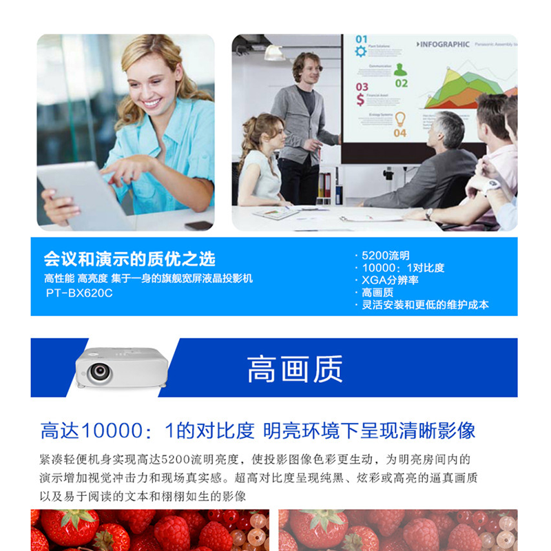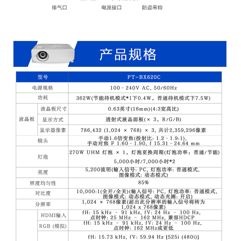 產(chǎn)品簡介:松下 BX620C,是一款高亮、緊湊、易于操作的便攜式投影機(jī),持久耐用的燈泡更換周期長,多功能環(huán)保性能有效保護(hù)環(huán)境,更多功能,既可攜帶又能吊裝。