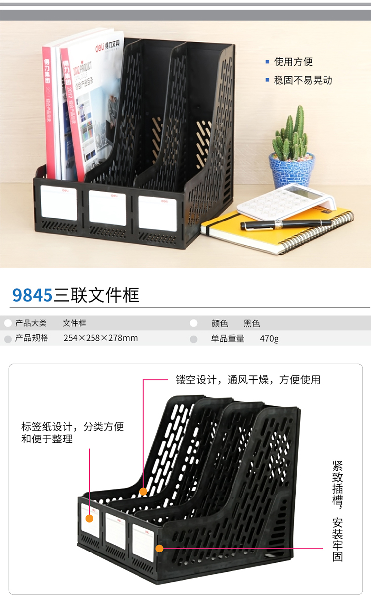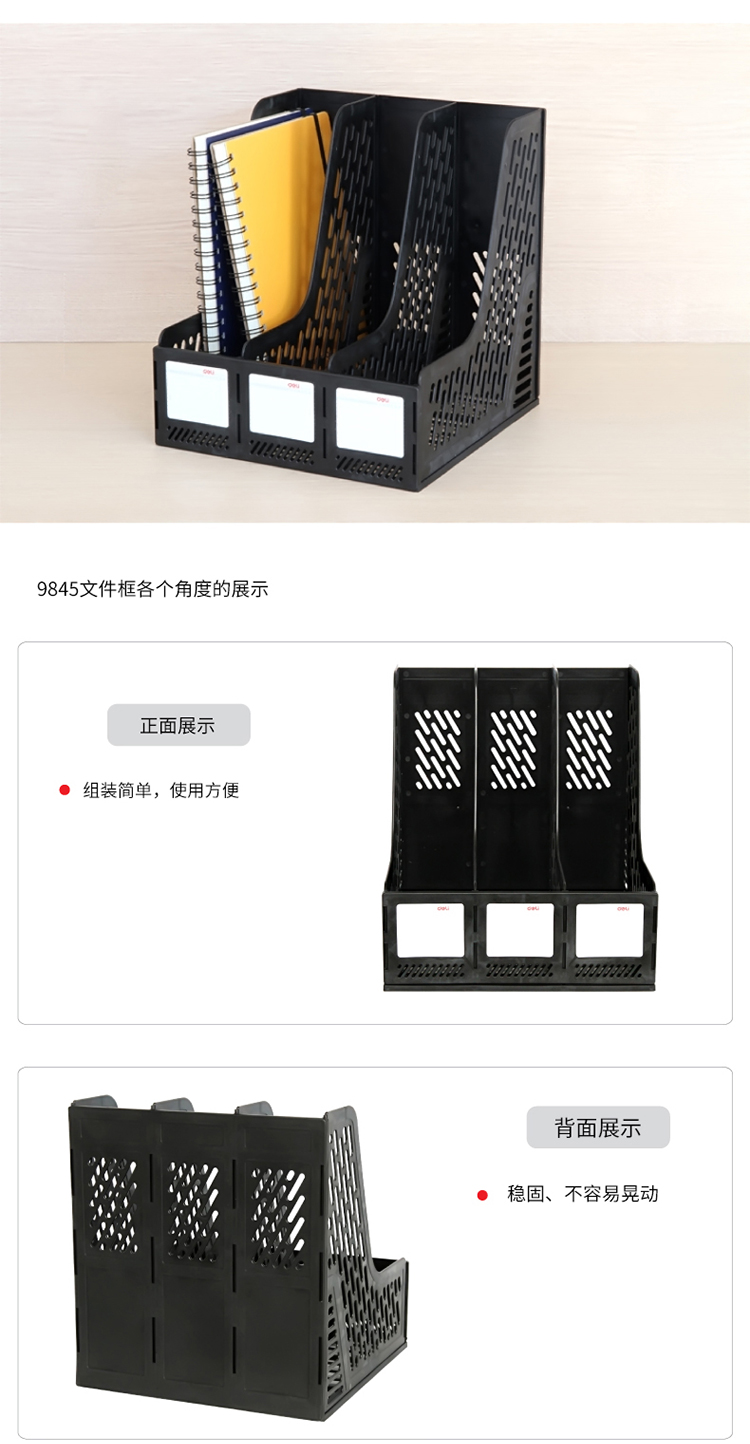 得力(deli)三聯(lián)鏤空桌面文件框 辦公室桌面多層資料架子 三欄帶標簽穩(wěn)固文件欄 黑色9845