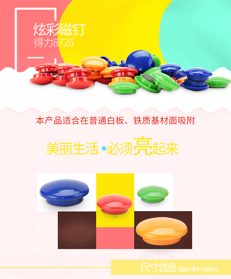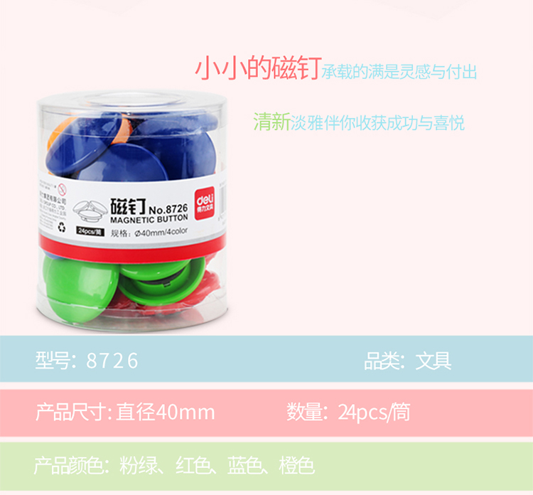 得力(deli) 8726 彩色白板磁釘/吸鐵石/磁鐵φ40mm 24粒/筒