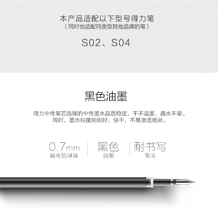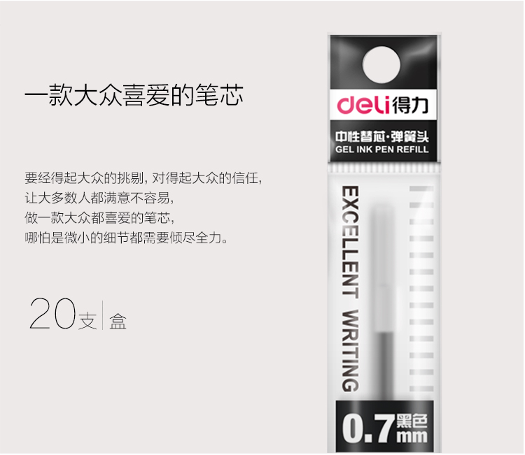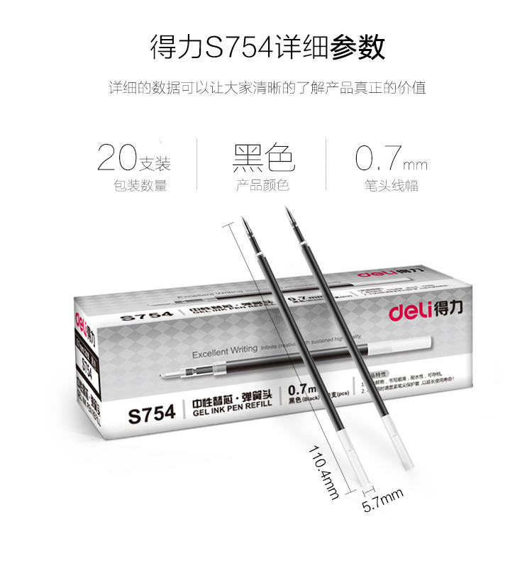 得力(deli)S754 中性筆芯 簽字筆芯0.7mm 20支/盒 (黑色)